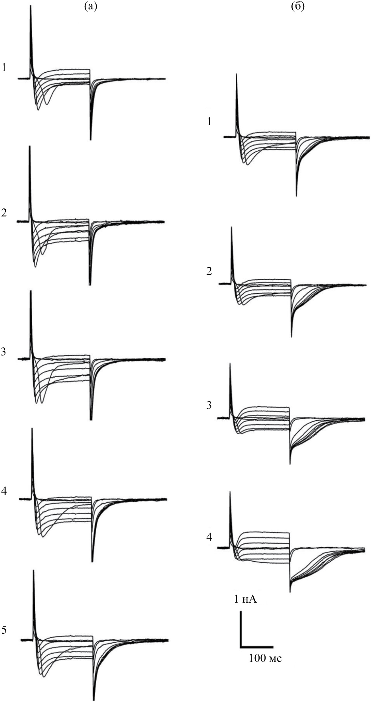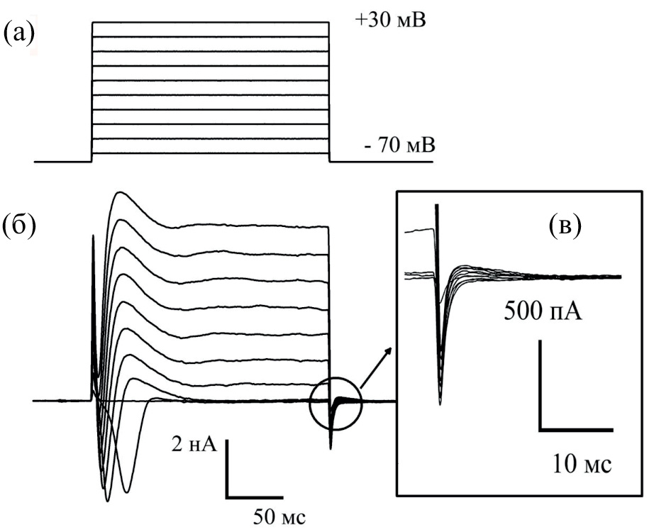 На рис. 1 показана запись протокола получения интегрального ответа электровозбудимых токов клетки (б) на серию деполяризующих импульсов (а) с шагом 10 мВ, от потенциала фиксации (–70) мВ до +30 мВ на мембране клетки. Условия регистрации: в пипетке ВПР с калием, снаружи — стандартный физиологический раствор. Токи, активирующиеся «вниз» сразу после подачи импульса, на рис. 1, б — входящие в клетку токи (натриевые и кальциевые); токи, активирующиеся «вверх» на протяжении действия импульса, — выходящие калиевые и катионные токи; небольшие токи, активирующиеся по окончании импульса, направленные «вверх», — входящие кальций-активируемые хлорные токи (показаны с увеличением на рис. 1в).
