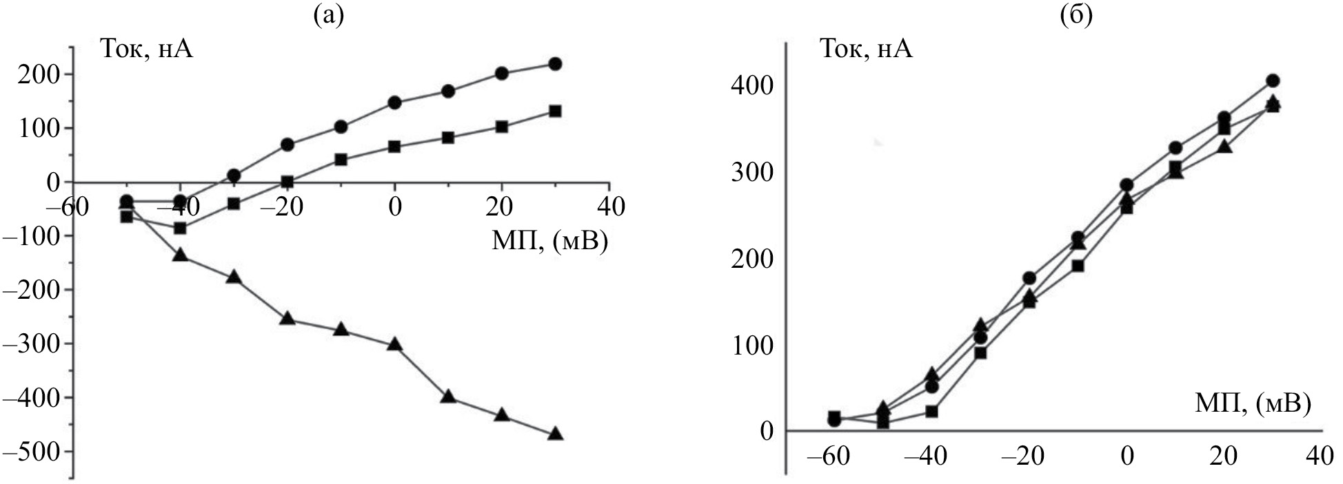 Рис. 6. Амплитуды КАХТ. а — при различных концентрациях ионов калия с наружной стороны (круги — [K+]нар. = 0 мМ, квадраты — [K+]нар. = 5 мМ, треугольники — [K+]нар. = 15 мМ); б — при различных концентрациях ионов цезия с наружной стороны (круги — [Cs+]нар. = 5 мМ, квадраты — [Cs+]нар. = 9 мМ, треугольники — [Cs+]нар. = 15 мМ)