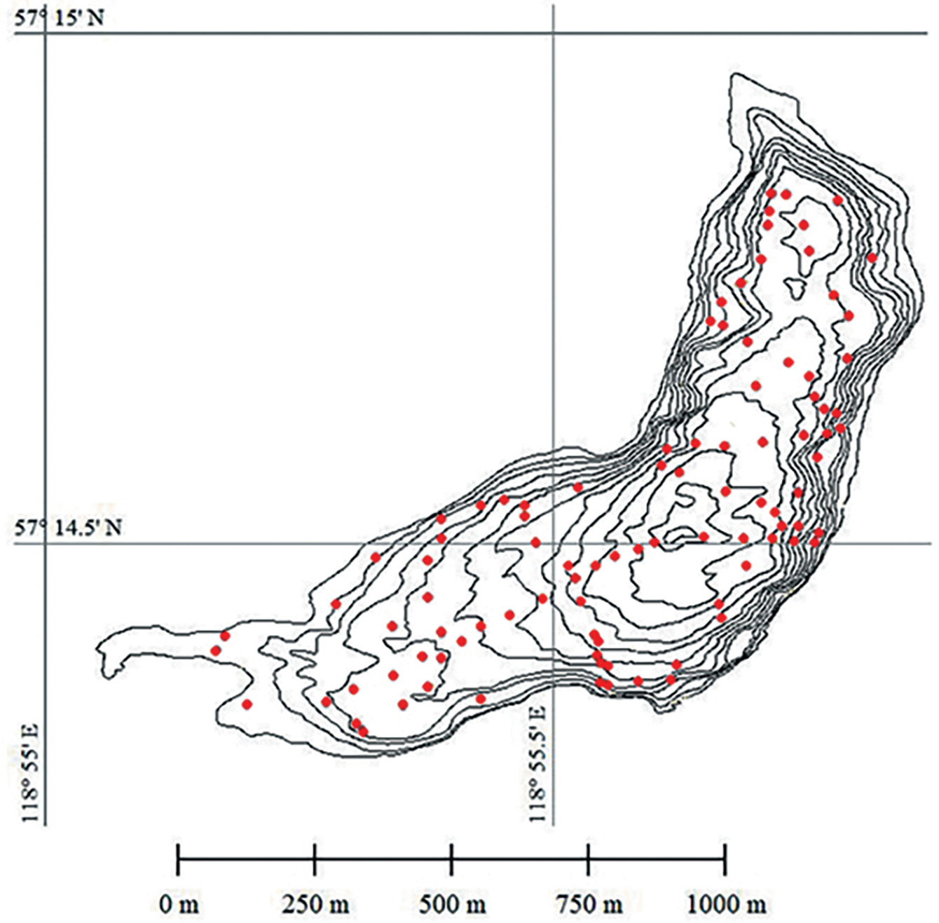 Рис. 2. Батиметрическая карта оз. Арбакалир (изобаты приведены через 5 см) с точками описания растительности