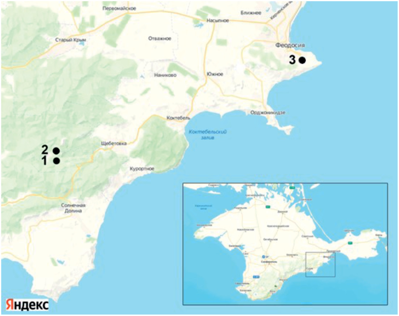 На территории Юго-Восточного Крыма O. purpurea отмечен как в степных (Меганом, Узун-Сырт, Тепе-Оба, Карадаг), так и в лесных ценопопуляциях (Карадаг, Кизилташ) (Миронова, Шатко, 2001, 2011; Шатко, Миронова, 2011, 2012; Миронова, Фатерыга, 2015). Вид встречается как одиночно, так и группами. Нами для исследования были выбраны три наиболее многочисленные ценопопуляции (ЦП): две в лесных сообществах и одна — в степном. Ценопопуляции из лесных сообществ располагались в горном массиве Кизилташ, ценопопуляция из степного сообщества — на хребте Тепе-Оба (рис. 1). Исследования проводились в 2015—2022 гг.