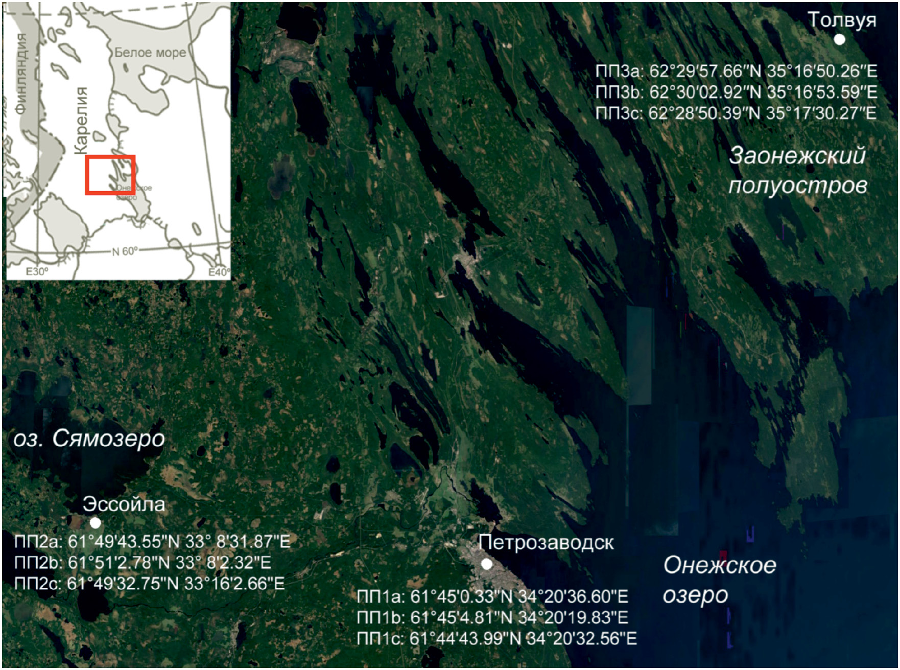Пробные площади (ПП) закладывались в районах, где имеются вышедшие из сельхозиспользования участки с различной давностью забрасывания, с восстановившимся к настоящему времени лесным покровом. Таким образом, были отобраны районы, располагающиеся в окрестностях Петрозаводска (ПП 1a, 1b, 1с) на подзолистых почвах (Retisols), в южном Сямозерье (вблизи н/п Эссойла) (ПП 2a, 2b, 2с) на альфегумусовых почвах (Podzols) и на Заонежском полуострове (вблизи н/п Толвуя) на органо-аккумулятивных почвах (Umbrisols) (ПП 3a, 3b, 3с) (рис. 1). При наличии, для предварительного отбора участков использовались имеющиеся фондовые и архивные материалы, ретроспективно характеризующие аграрное освоение территории (аэрофото- и спутниковые снимки, межевые планы и др.).