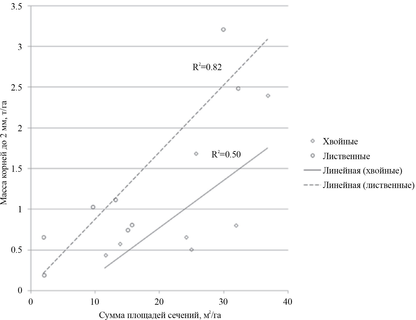При изучении связи подземной части древостоя с надземной рассматривали, будет ли изменяться масса тонких корней с увеличением суммы площадей сечений. Была получена тенденция увеличения массы корней с ростом суммы площадей сечений (рис. 5). Следует отметить, что для лиственных пород коэффициент детерминации значительно выше (0.82), чем для хвойных (0.50). В то же время в связи с ограниченным набором данных зависимость носит предварительный характер.