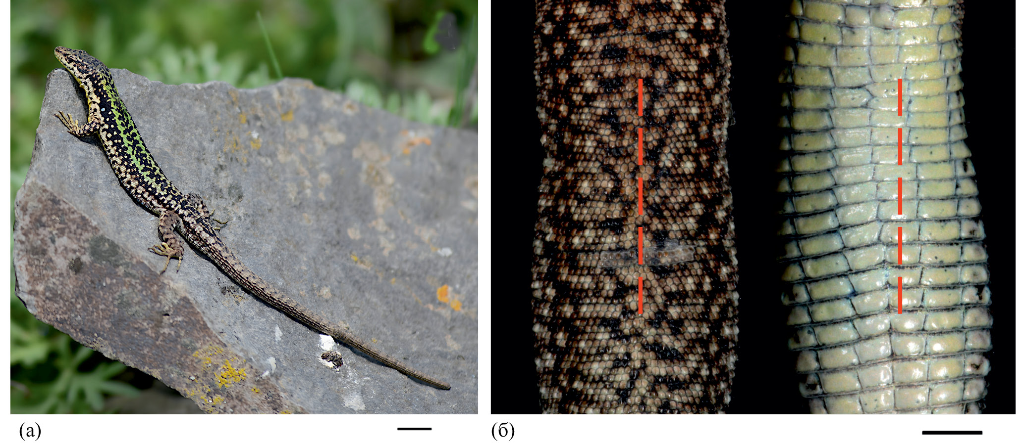 Рис. 1. Взрослая особь Darevskia valentini в естественной среде обитания (a) и внешний вид кожного покрова ювенильной особи D. valentini (б), слева – дорсальная сторона, справа – вентральная сторона, красной штриховой линией обозначены места взятия проб на гистологию (сагиттальные срезы). Масштаб 2 мм.