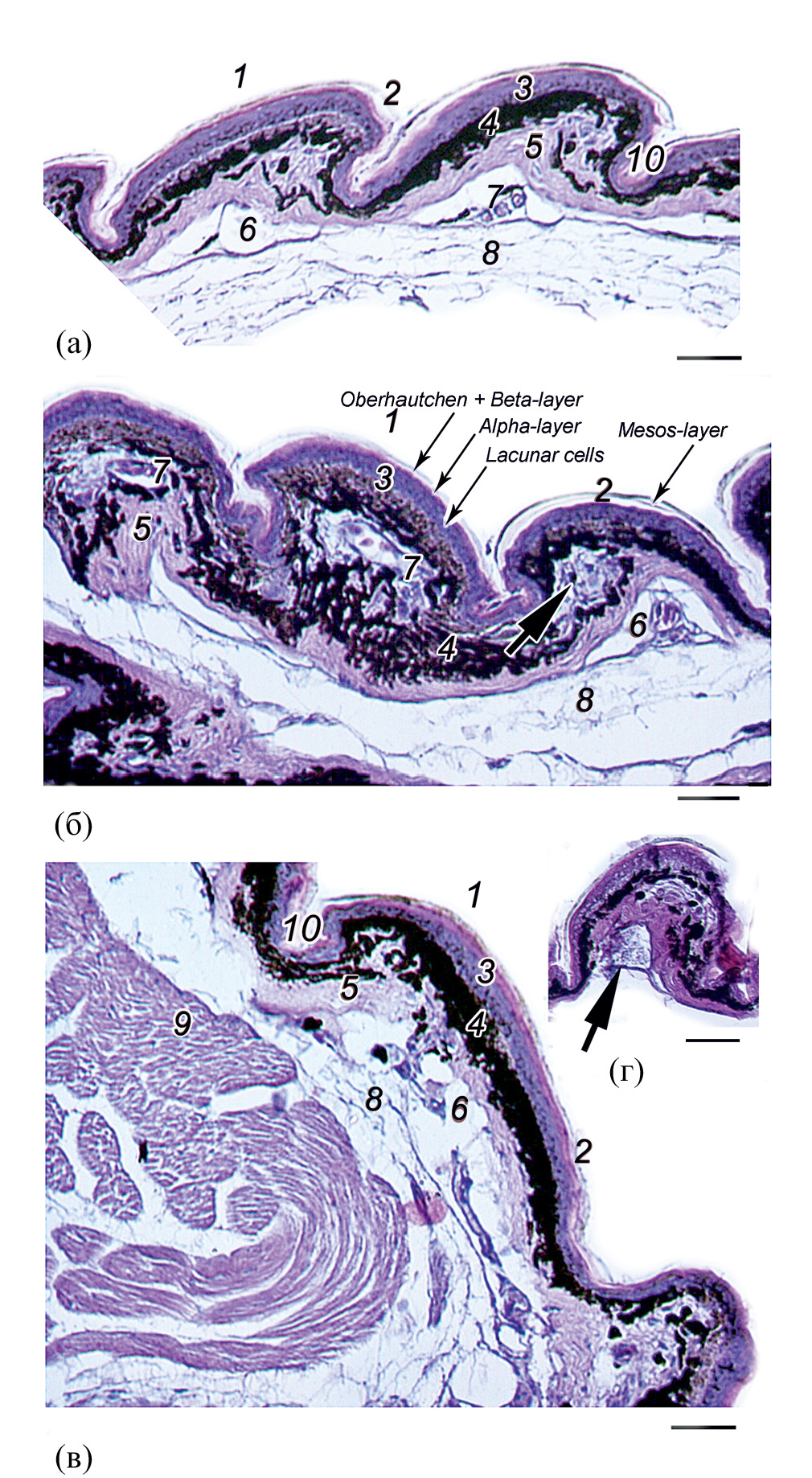 Все слои кожи в межчешуйном кармане нормально сформированы, за исключением ß-слоя, который не развит. Его стенки – гладкие или имеют незначительно выраженные кожные утолщения, иногда формирующие мелкие дивертикулы, однако, структур, сколько-нибудь напоминающих извитые щелевые образования, характерные для межчешуйных карманов ящериц, способных захватывать и транспортировать воду на поверхности тела (Sherbrooke et al., 2007), мы не обнаружили.
