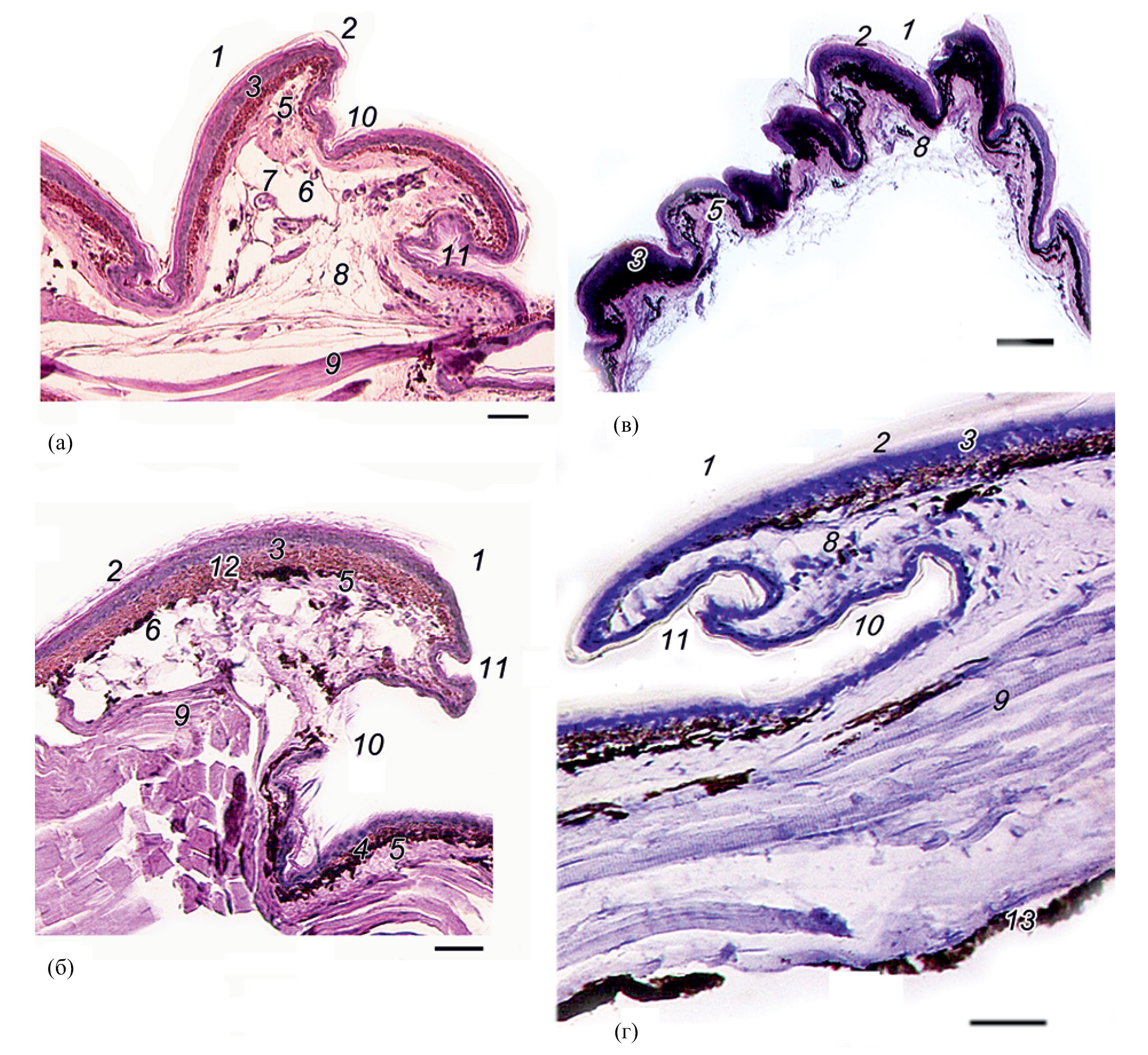 Рис. 4. Микроструктура бугорчатых дорсальных чешуй (в) и брюшных щитков (a, б, г) взрослых особей Darevskia nairensis (а, б) и D. raddei (в, г) на сагиттальных срезах. Обозначения как на рис. 2, 3, 12 – слой ксантофоров, 13 – пигментированная выстилка брюшной полости. Окраска гематоксилин-эозином + суданом Ш (липидные пласты не выявлены) (в, г). Микрофото. Масштаб 20 мкм.