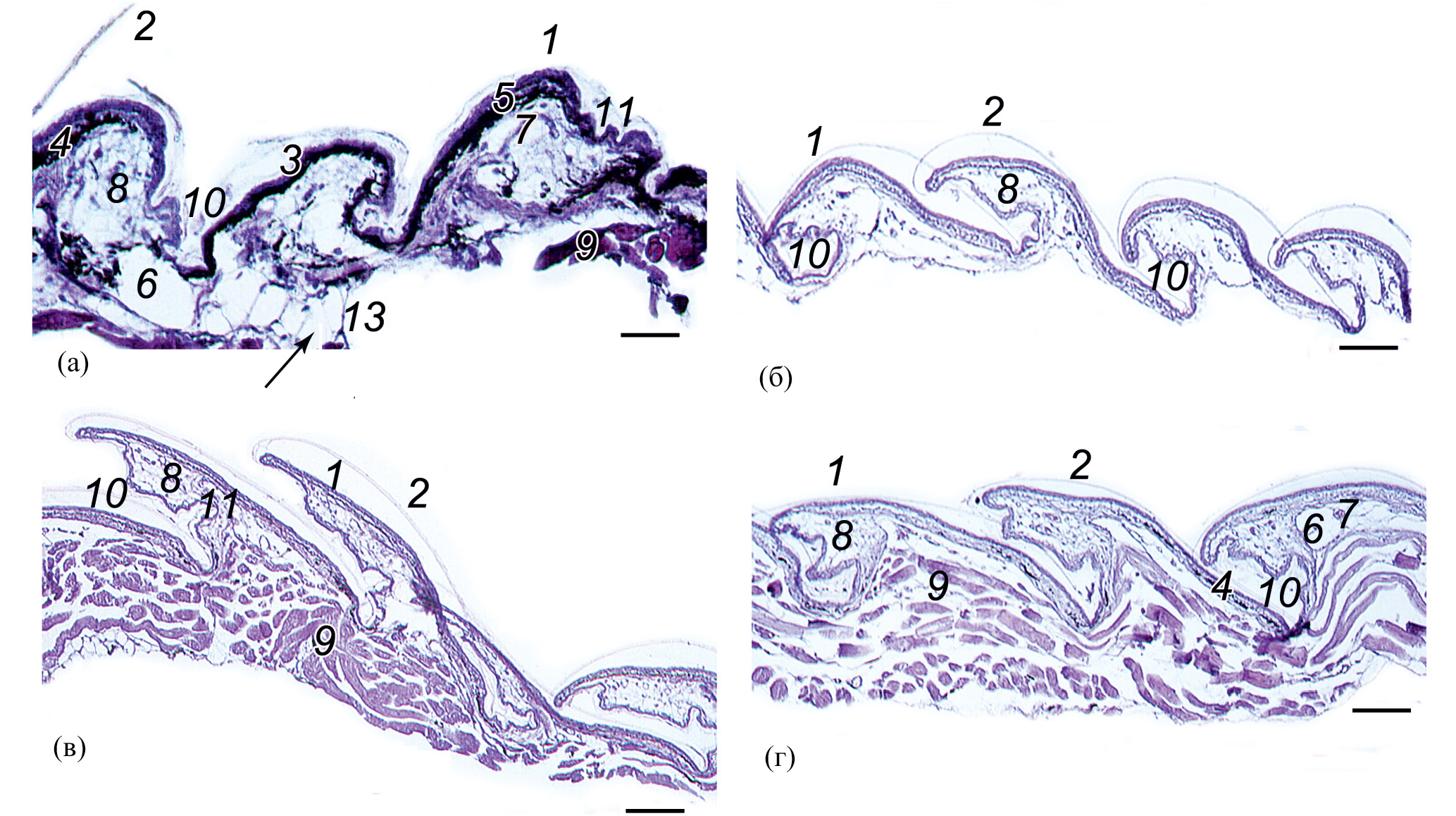 У ювенильных особей (D. valentini) складчатость кожи, выстилающей стенки чешуйного кармана, также хорошо выражена. У них в пластинчатой коже брюха внутренняя поверхность чешуи, помимо дивертикулов имеет широкую и толстую соединительнотканную складку (трапециевидную на сагиттальном срезе, рис. 5б‒г, 5, 8, рис. 7б, 6), к которой подходит хорошо развитая (как и у взрослых особей) подкожная поперечнополосатая мускулатура, заходящая внутрь чешуй (рис. 5в, г, 9, рис. 7б, 4).
