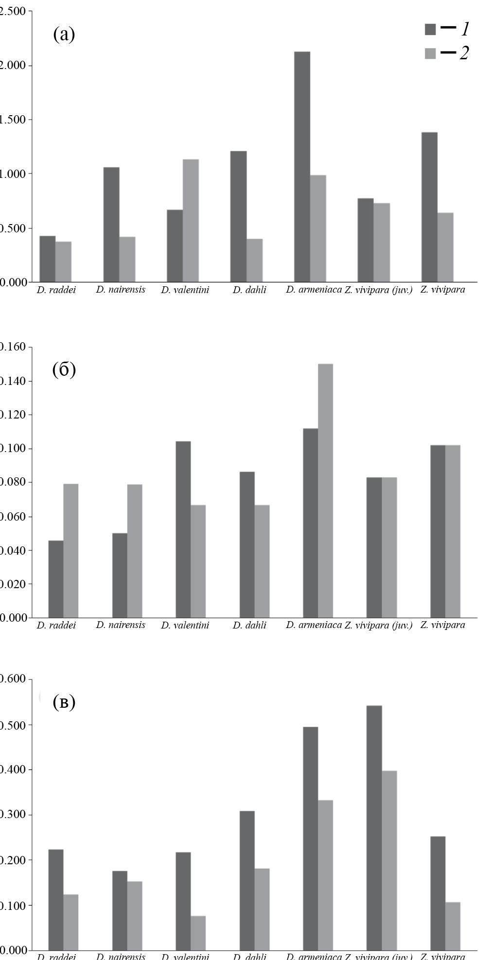 Рис. 9. Приведенные к длине тела (SVL) значения толщины кожи и различных ее слоев (мкм/мм) на дорсальной (1) и вентральной (2) сторонах туловища исследованных ящериц. Общая толщина кожи (а), толщина надкожицы с ß-слоем (б), и эпидермиса (в).