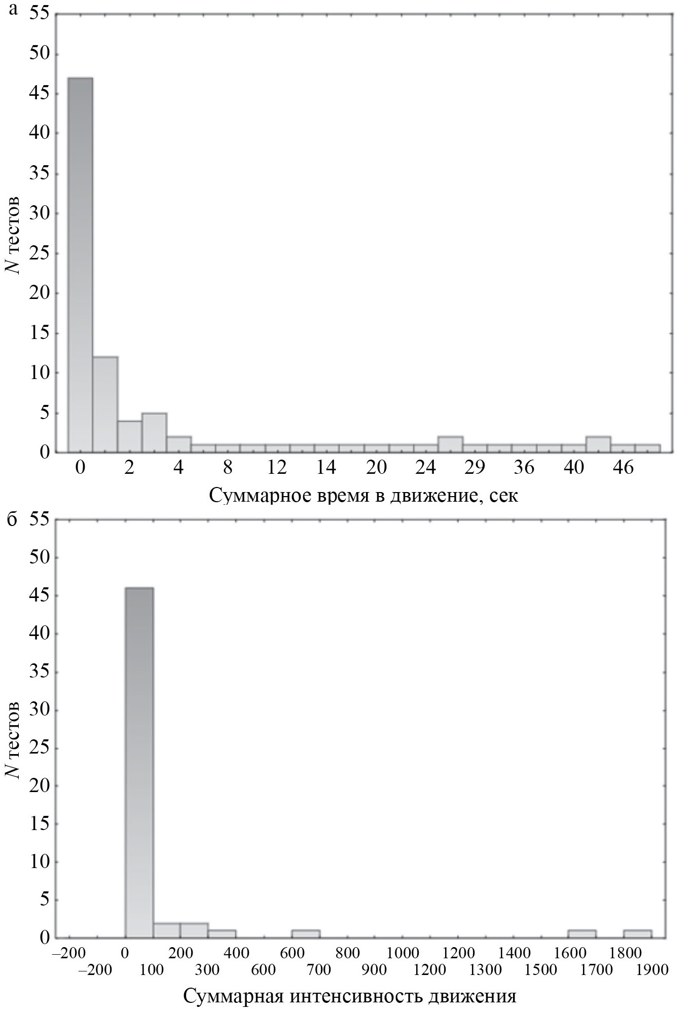 Рис. 2. Распределение результатов на покорность у детенышей желтого суслика. (а) Тест 1, на время в движении, N = 91, продолжительность теста 60 сек; (б) Тест 2, на интенсивность движения, N = 53, продолжительность теста 60 сек, по оси абсцисс безразмерная величина, характеризующая суммарную амплитуду движений зверька, складывающуюся из суммарного ускорения по трем координатным осям в трехмерном пространстве, которое регистрировалось с частотой 200 раз в секунду, за вычетом уровня «шума», специфического для каждого теста.