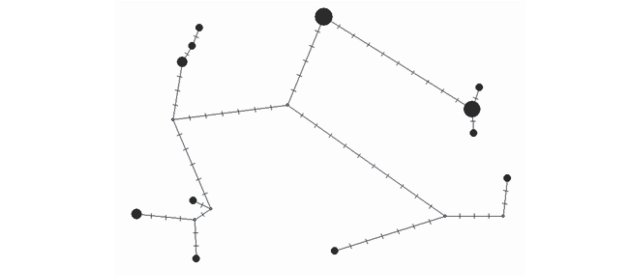 Рис. 1. Медианная сеть гаплотипов по фрагменту контрольного региона мтДНК (448 п.н.) музейных образцов сайгака из популяции Северо-Западного Прикаспия. Мутационные позиции обозначены на ветвях вертикальными линиями, а диаметр кругов пропорционален числу образцов в гаплотипах.