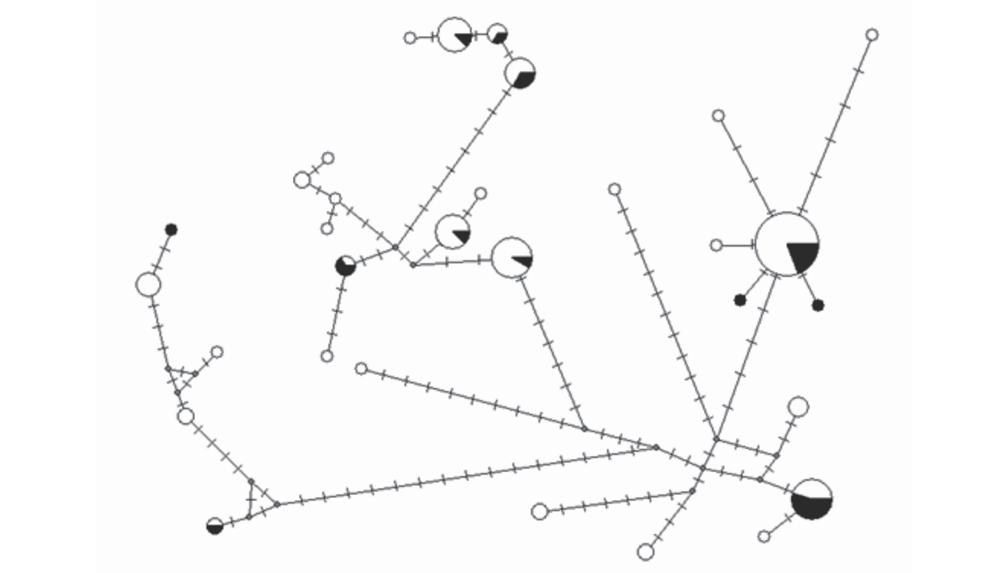 Рис. 2. Медианная сеть гаплотипов контрольного региона мтДНК сайгака из популяции Северо-Западного Прикаспия (448 п.н.). Черным цветом обозначены музейные образцы (1957–1958 гг.) Белым цветом обозначены современные образцы (1999–2016 гг.). Мутационные позиции обозначены на ветвях вертикальными линиями, а диаметр кругов пропорционален числу образцов в гаплотипах.