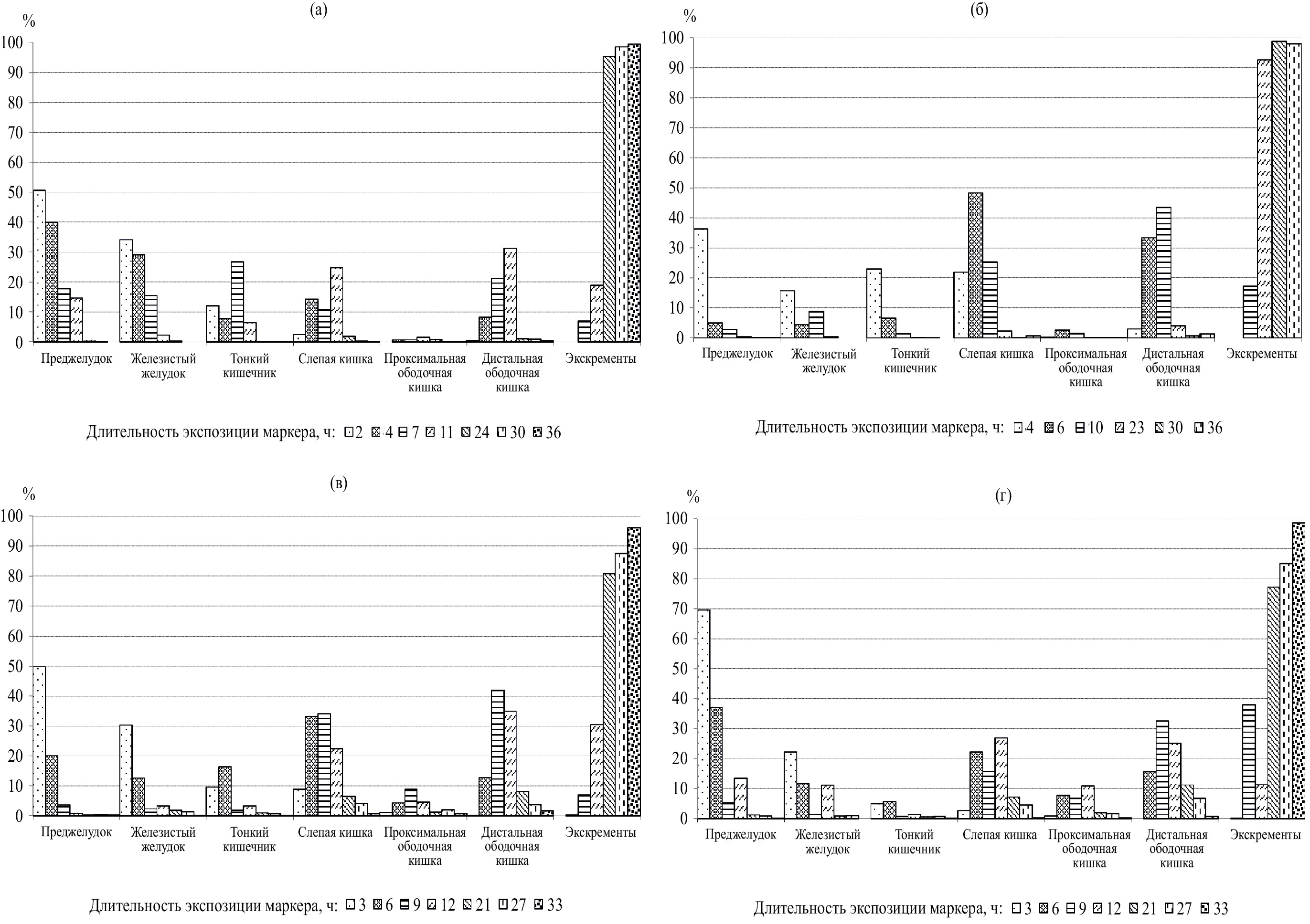 Данные по распределению маркеров, объединенные в диаграммы (рис. 3), отражают весь процесс продвижения корма, потребленного животными за период 33–36 ч. Детальный анализ распределения маркеров позволил визуализировать динамику прохождения корма через отдельные органы пищеварительного тракта.