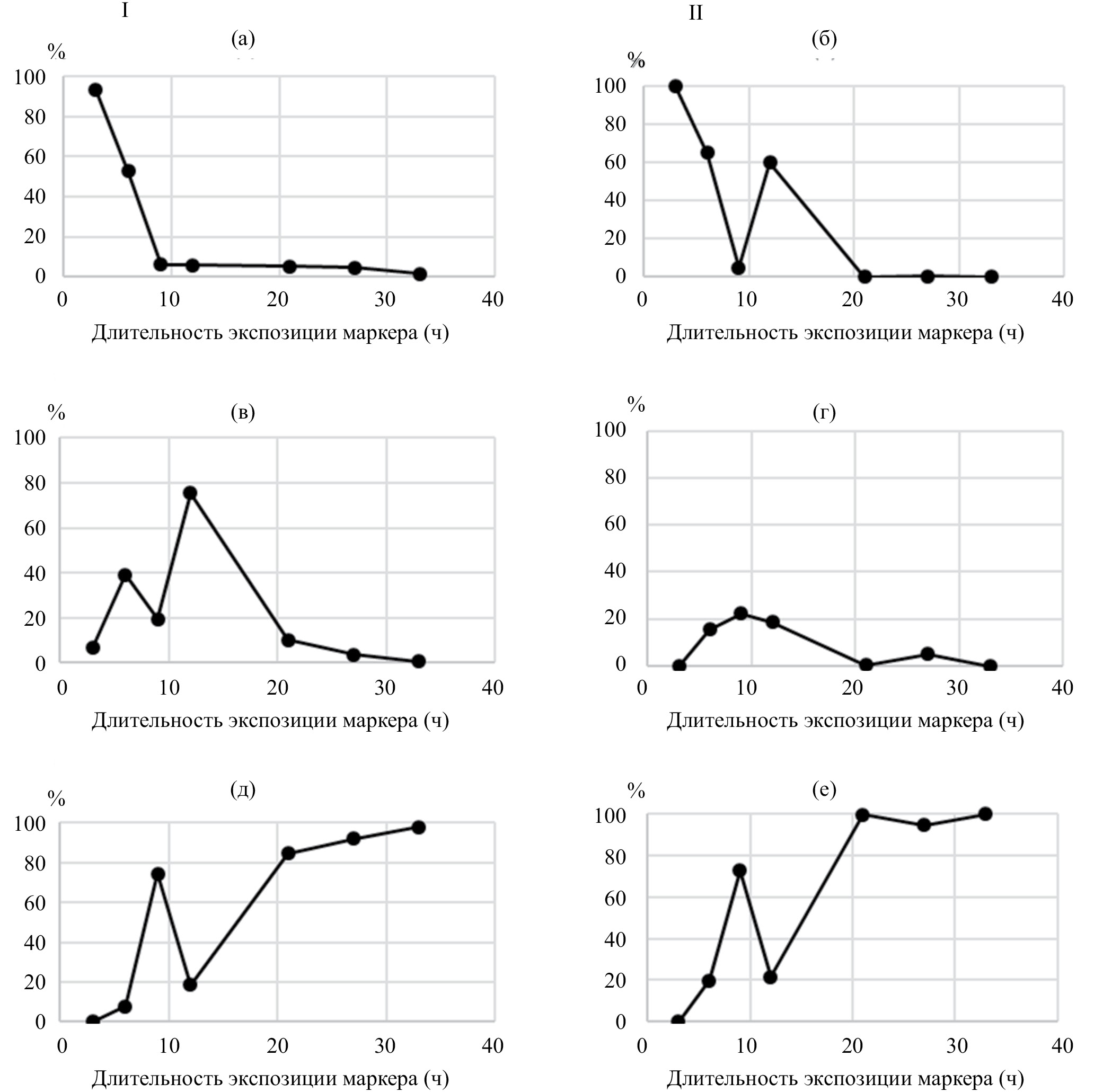 Рис. 2. Индивидуальные различия во временной динамике выведения меченого корма при потреблении A. articulata. I, II – разные особи; а, б – желудок; в, г – слепая кишка; д, е – экскременты.