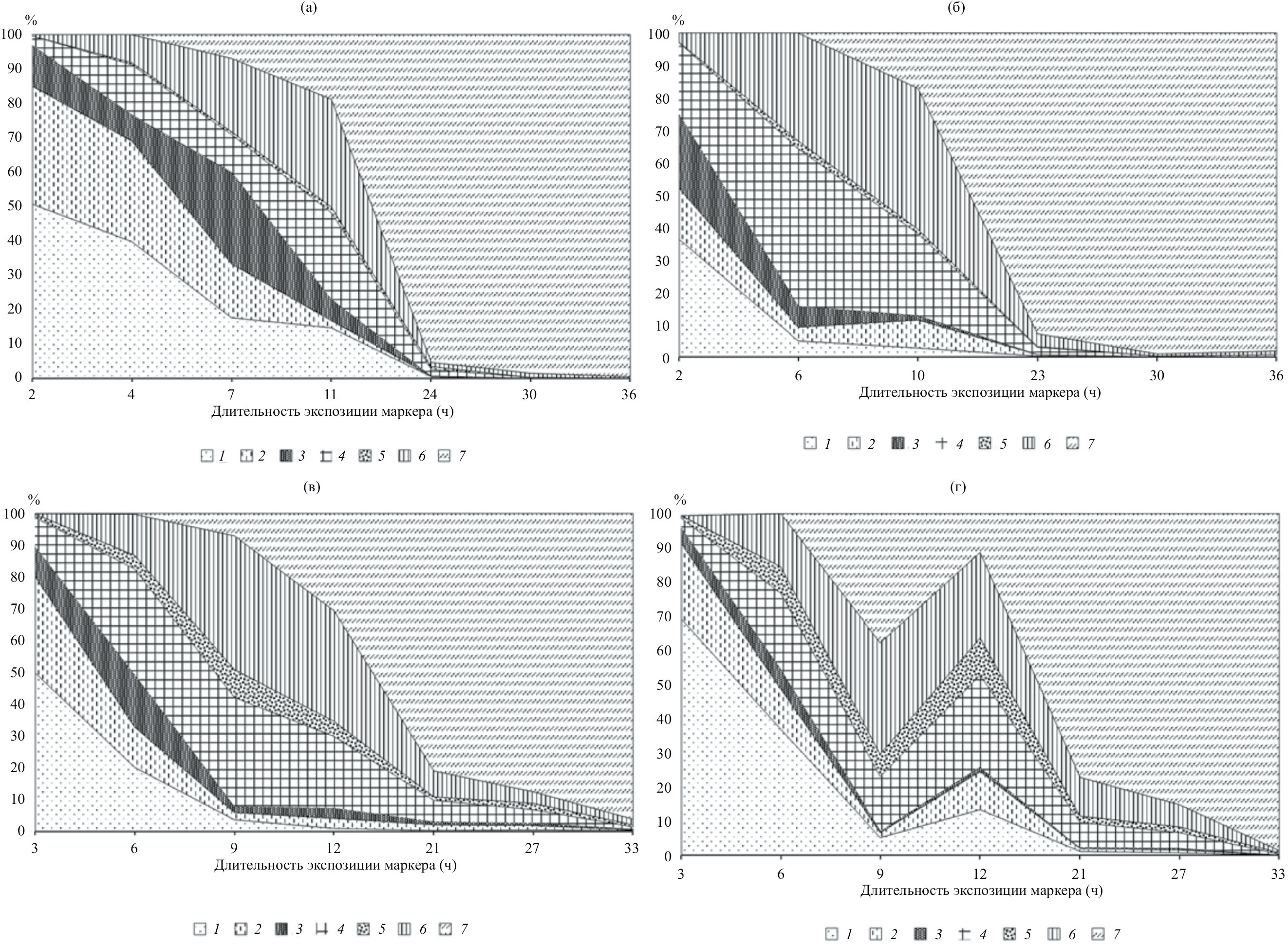 Рис. 3. Прохождение кормов: A. halimus (а), S. monoica (б), S. tetrandra (в), A. articulata (г) по отдельным органам ПТ: 1 – преджелудок, 2 – железистый желудок, 3 – тонкий кишечник, 4 – слепая кишка, 5 – проксимальная ободочная кишка, 6 – дистальная ободочная кишка, 7 – экскременты.