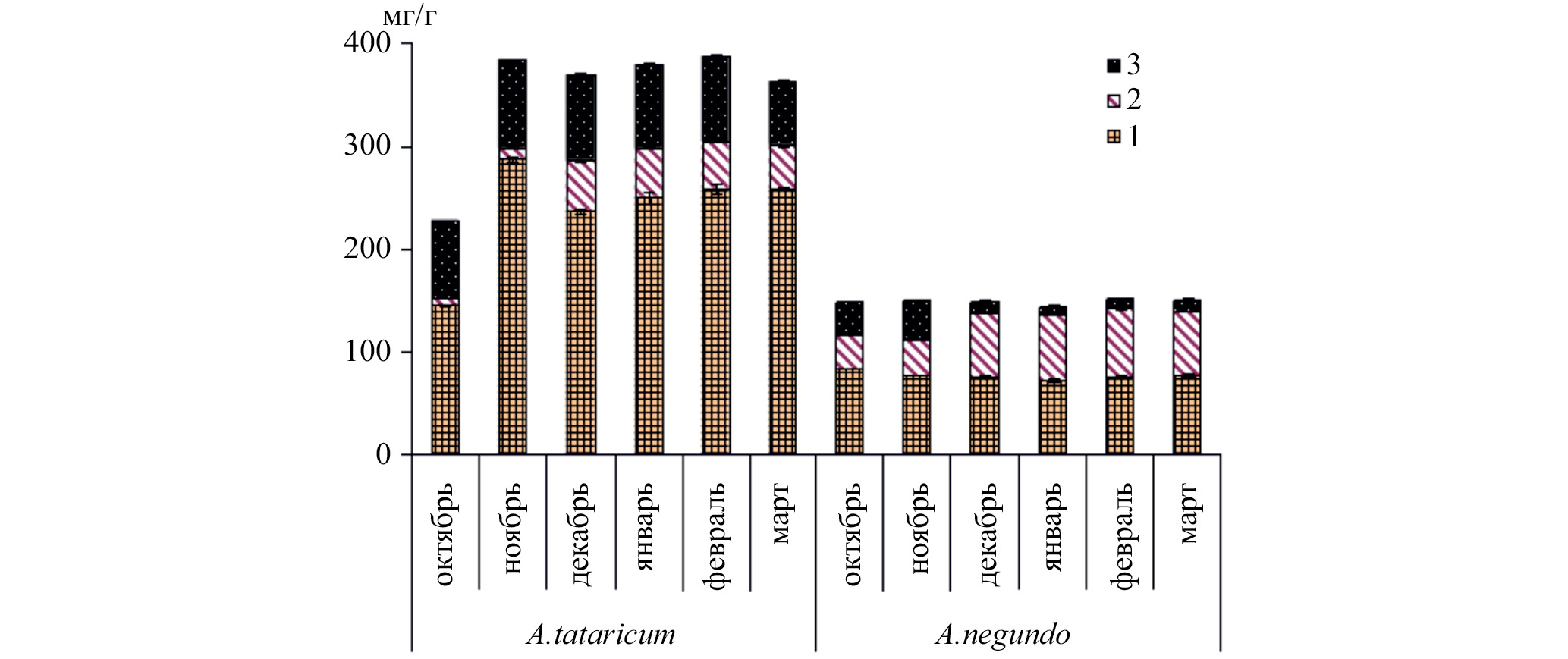 С формированием протекторных антистрессовых механизмов связаны наиболее часто встречающиеся в растениях фенольные соединения ‒ флавоноиды (Pourcel et al., 2007). Среди этих многофункциональных соединений выделяют семь групп, различающихся по химическому строению и свойствам, участвующих в окислительно-восстановительном метаболизме (Волынец, 2013; Загоскина, 2018). Флавоноиды, по-видимому, играют значительную роль в процессе дозревания семян. Высокая антиоксидантная активность обнаружена как в водных, так и в спиртовых экстрактах из молодых листьев, женских и мужских цветков A. negundo (Виноградова и др., 2022). В цветках A. negundo содержатся флавоноиды, обладающие антиоксидантной активностью, а в зрелых плодах их уровень в 3 раза ниже, чем в зеленых (Куклина, Цыбулько, 2020). Значительные отличия выявлены нами между семенами A. negundo и A. tataricum по содержанию флавоноидов. В семенах A. negundo уровень флавоноидов стабильный и невысокий по сравнению с A. tataricum с октября по март (табл. 3). В семенах A. tataricum наибольшее количество флавоноидов отмечено в октябре. В ноябре их содержание резко снизилось в это же время значительно возросло количество моносахаридов. В тот же период, в ноябре зафиксировано поражение семян A. tataricum кленовым долгоносиком-семяедом ~ до 30%. Поскольку флавоноиды часто находятся в растительных тканях в форме гликозидов, возможно, при расходовании активной части молекулы на метаболические процессы высвобождаются моносахара, пополняющие фонд запасных углеводов. В дальнейшем с ноября по март сумма флавоноидов в семенах A. tataricum оставалась стабильной (табл. 3).