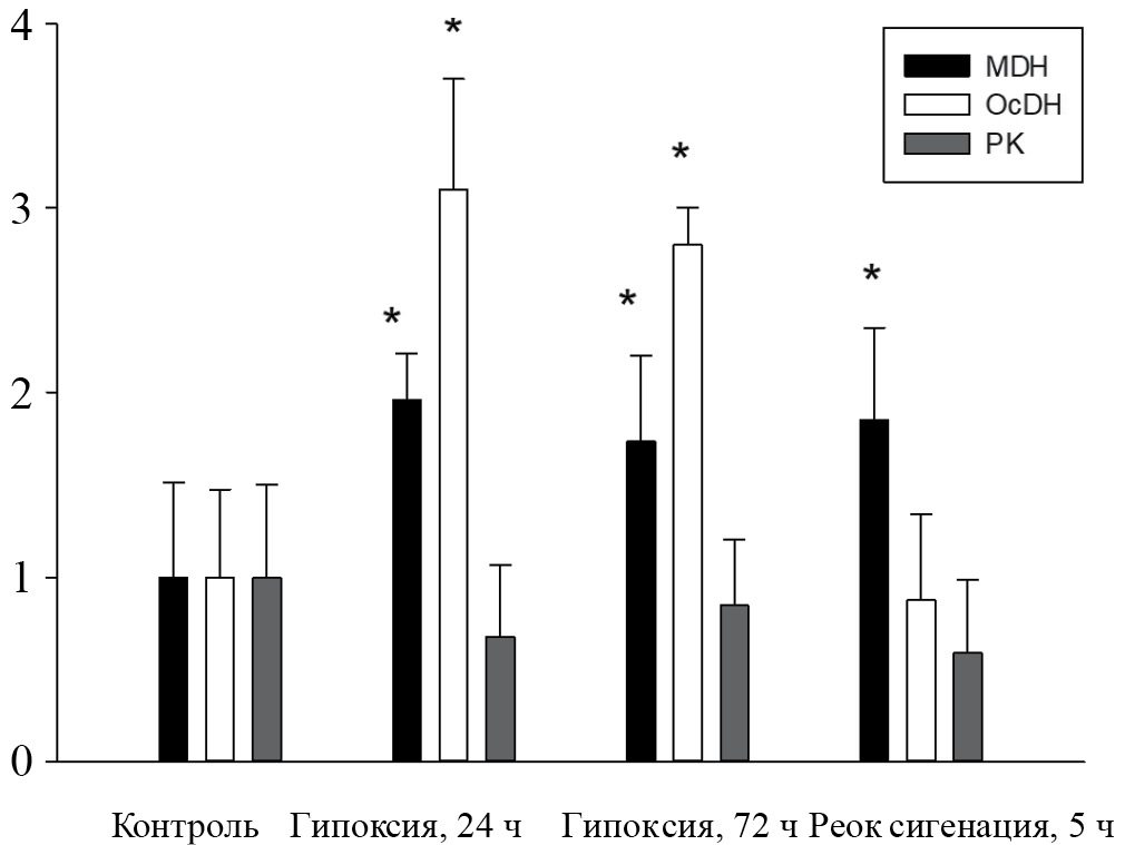Результаты исследований представлены на рис. 1. Как видно, значительные изменения уровня экспрессии отмечались со стороны генов MDH и OcDH. В обоих случаях в условиях гипоксии (24 и 72 ч) отмечали рост значений соответственно в 2 и 3 раза (p<0.05). После реоксигенации уровень экспрессии OcDH восстанавливался до исходных значений, тогда как экспрессия MDH сохранялась на относительно высоком уровне. При этом повышалась вариабельность регистрируемых значений.