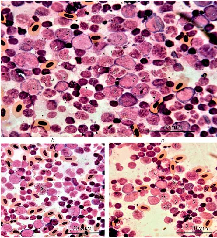 Рис 1. Лейкоциты пронефроса (а, б, в ) Coregonus migratorius, окраска азур-эозином: 1 – бласт, 2 – миелоцит, 3 – метамиелоцит, 4 – палочкоядерный нейтрофил, 5 – сегментоядерный нейтрофил, 6 – пролимфоцит, 7 – лимфоцит, 8 – базофил, 9 – промоноцит, 10 – моноцит.