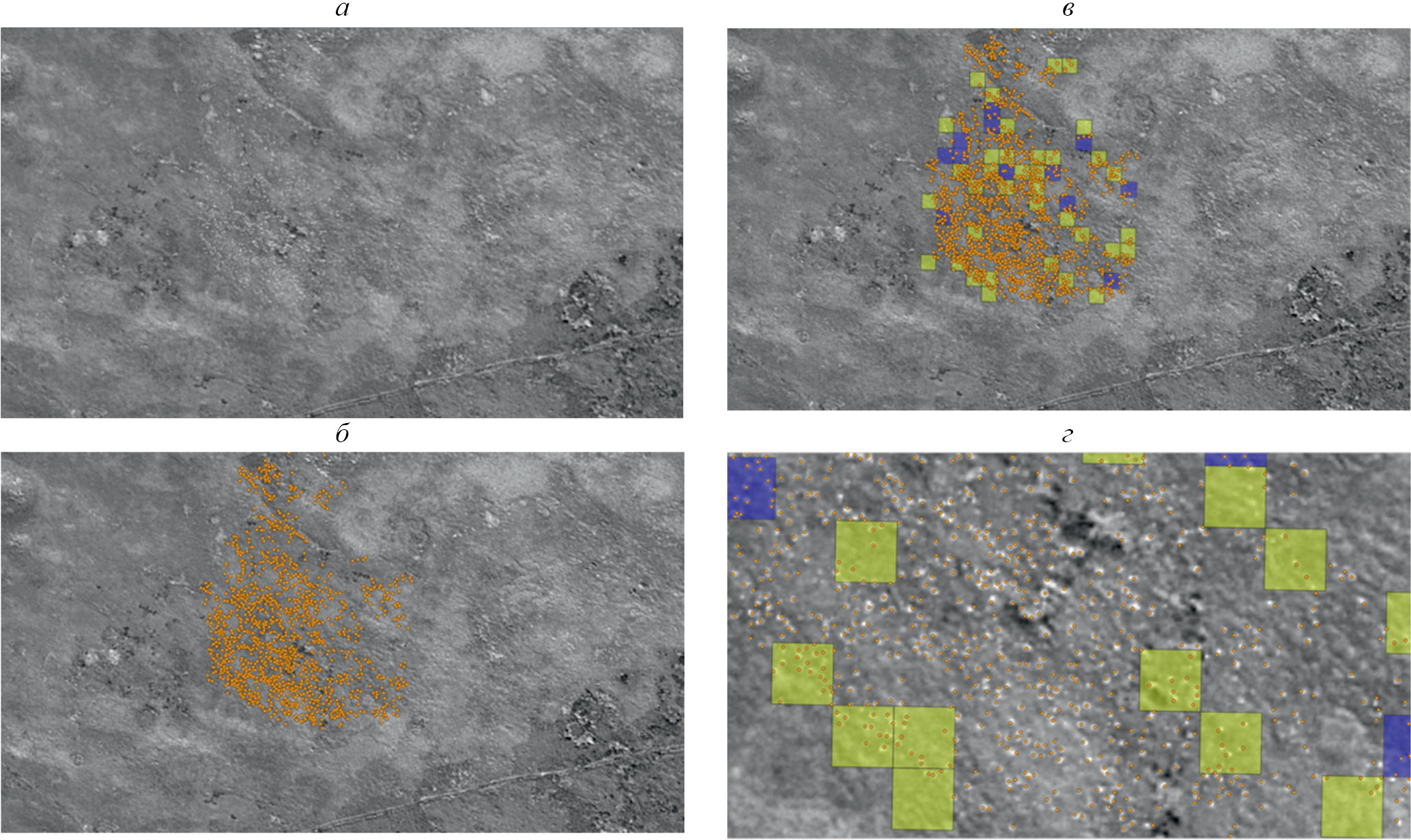 Рис. 4. Часть спутникового снимка №1 с изображением стада сайгаков (а); сайгаки, выявленные экспертом-зоологом в ручном режиме (б); ИП фрагменты снимка, выявленные нейронной сетью (в).