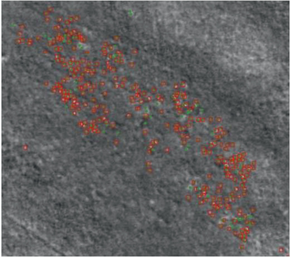 Рис. 10. Часть спутникового снимка №1, не прошедшего обработку с помощью ГКНС-К, с изображениями сайгаков, выявленными экспертом-зоологом (зеленые точки), и объектами, выявленными нейронной сетью ГКНС-В (красные рамки) — выявлено большое количество ложных объектов вдали от стада сайгаков.