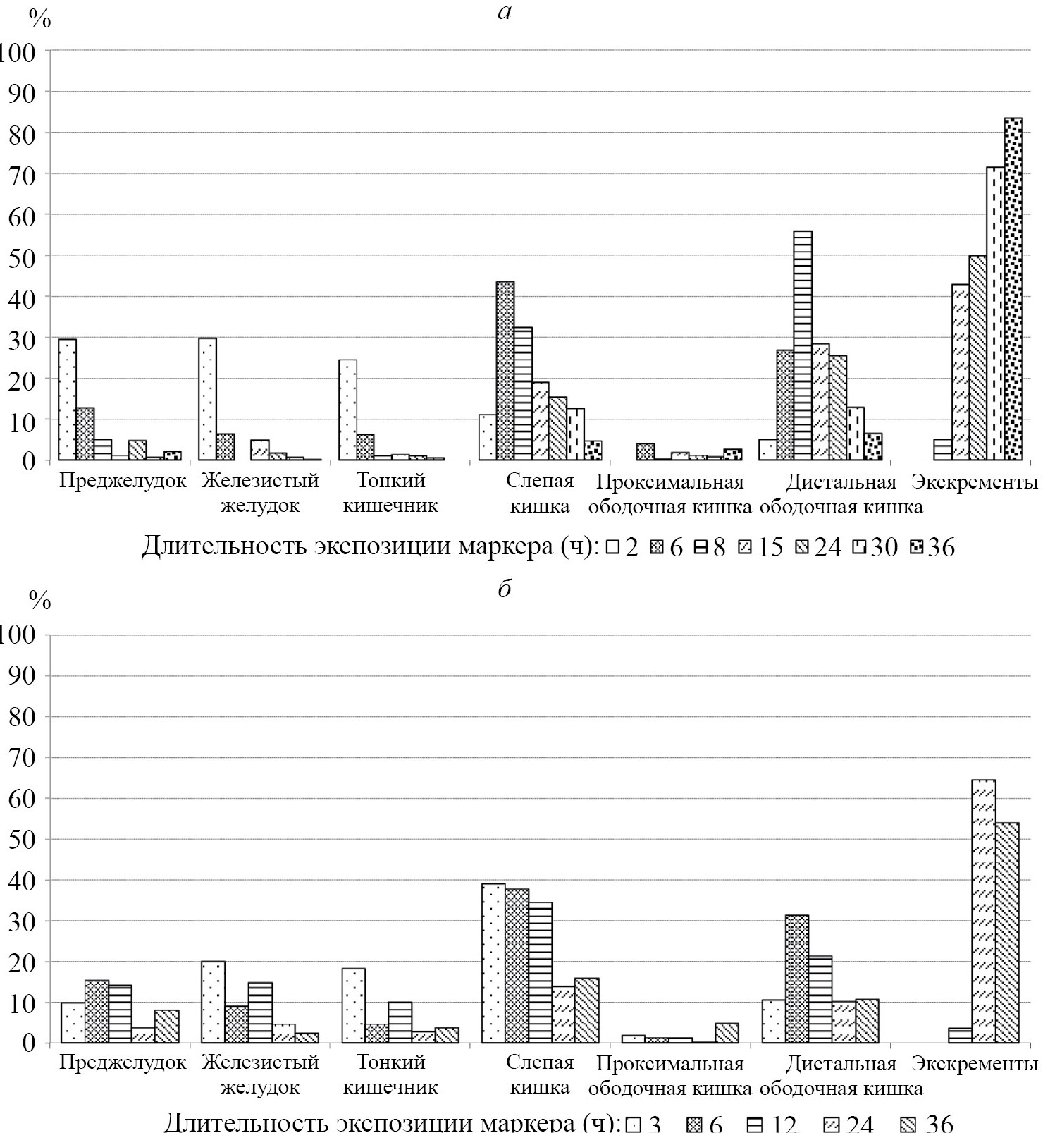 Дальнейшее мечение показало последовательное прохождение вводимых в ПТ маркеров и их задержку в слепой кишке, а большая часть оставшихся частиц маркеров задержалась в преджелудке. При самой длительной экспозиции (24, 30 и 36 ч) в желудке все же оставались следовые количества маркеров. Через 6–8 ч в слепой кишке скопилось до 45% маркеров, а через 8 ч началось их активное выведение с экскрементами. Через 24 ч в слепой кишке еще оставалось более 15 % маркеров, а через 36 ч – около 5%. В проксимальной части ободочной кишки маркеры почти не задерживались. В дистальной части ободочной кишки наибольшая концентрация маркеров наблюдалась при 8-часовой экспозиции (более 50%).