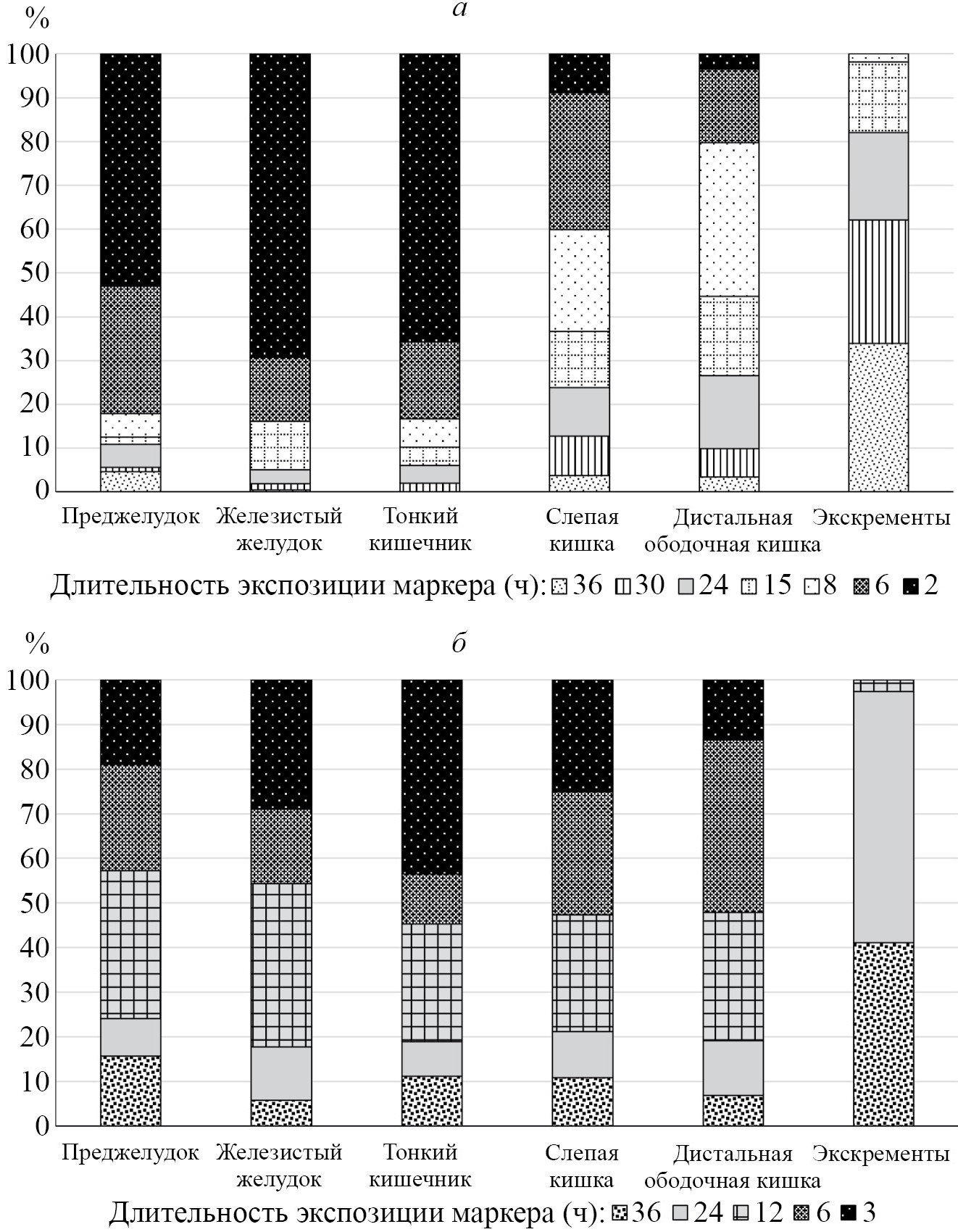 Расчет количественного соотношения маркеров, поступивших в желудок в разное время, и задержавшихся в ПТ до конца экспериментов, позволил зарегистрировать два варианта распределения корма (рис. 2) в зависимости от длительности экспозиции и времени поступления маркеров в ПТ. При этом проявились четкие различия между характером локализации маркированных порций корма, съеденных в разное время суток. В обеих экспериментальных группах следует отметить быстрое поступление части маркеров в слепую кишку (через 2–3 часа) и длительную задержку (на весь экспериментальный период) части маркированного корма в преджелудке. Важное различие между группами заключается в длительности задержки корма, съеденного на разных стадиях кормовой активности.