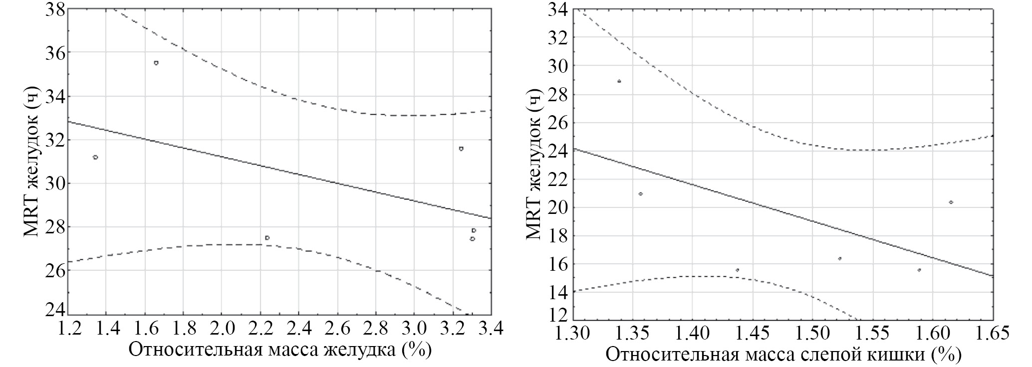 Рис. 4. Корреляция между относительной массой желудка и длительностью задержки в нем корма (а), r = –0.5591, и относительной массой слепой кишки и длительностью задержки в ней корма (б), r = –0.5906