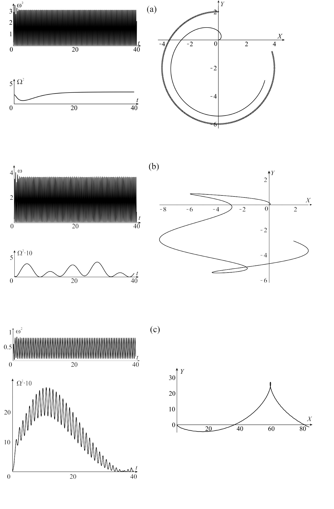 Согласно численным экспериментам при движении цели с постоянной скоростью, система (3.6) при приобретает периодическую динамику. Имеет место вековой уход траекторий точек платформы вдоль оси .