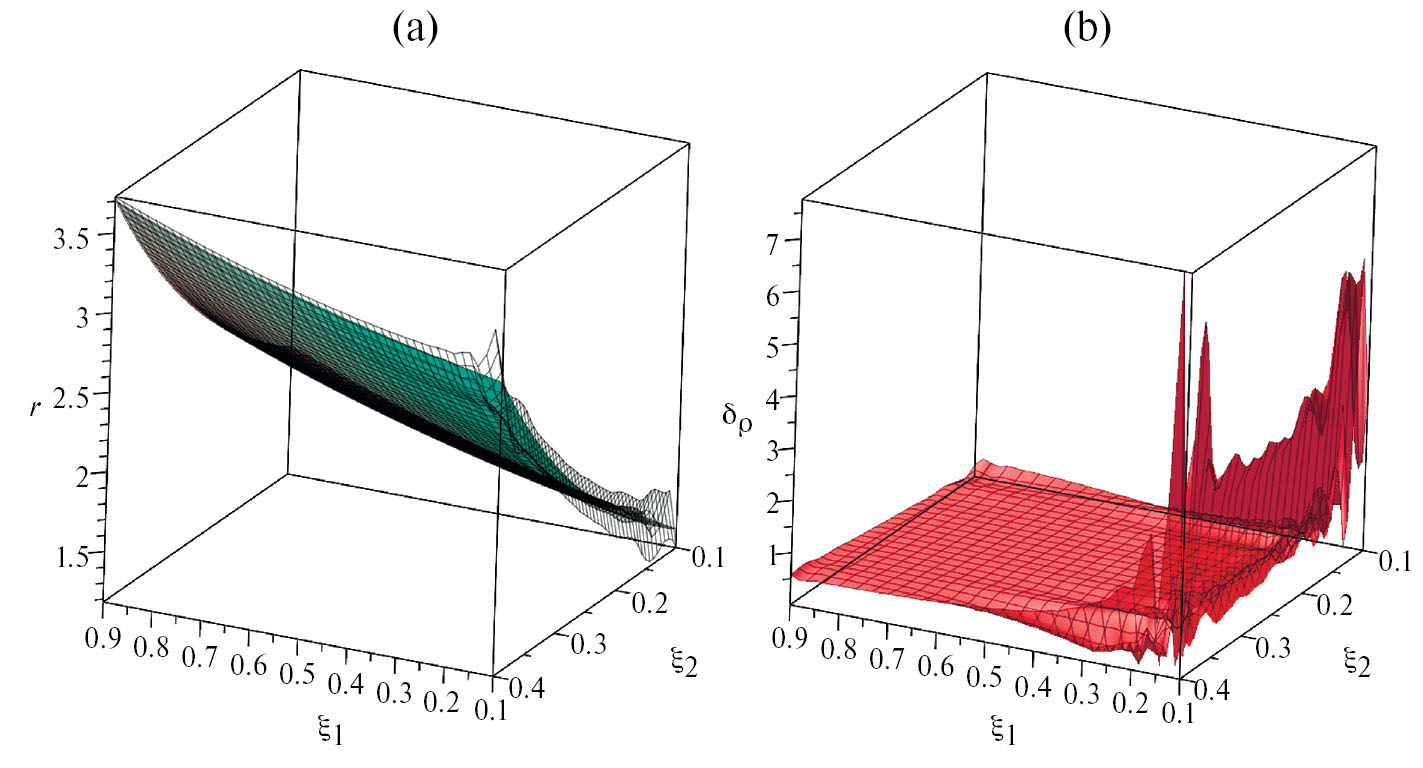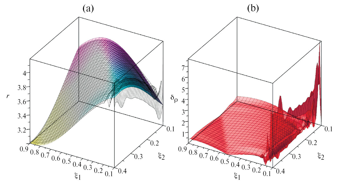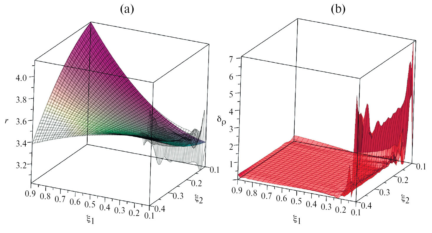 Рис. 6. (a) графики точной квадратичной функции rex(ξ₁,ξ₂) = fρ(ξ₁,ξ₂) при n = m = 2 (сплошная поверхность) и восстановленной функции rrec(ξ₁,ξ₂) (сетка); (b) график функции относительной погрешности δρ(ξ₁,ξ₂).