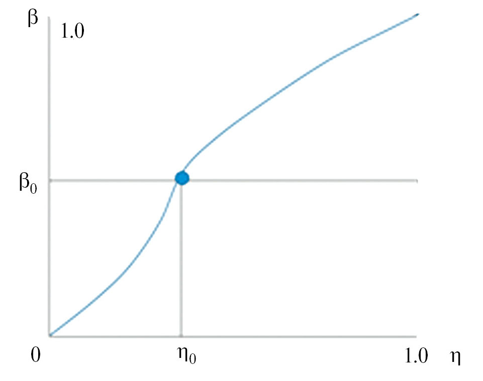 Понятно, что начальному значению параметра несовершенства b* соответствует начальный параметр порядка η*. При переходе материала в запредельную область сопутствует смена типа устойчивости, обусловленная сильными структурными флуктуациями. Поэтому появление на графике β ~ η точки перегиба, соответствующей пределу прочности материала (η = η0), вполне предсказуемо.