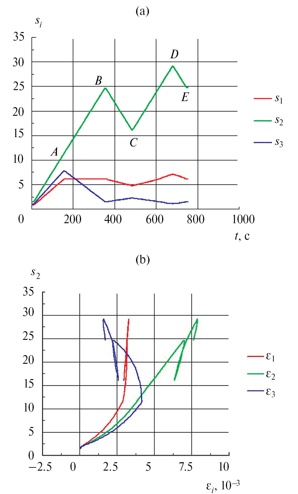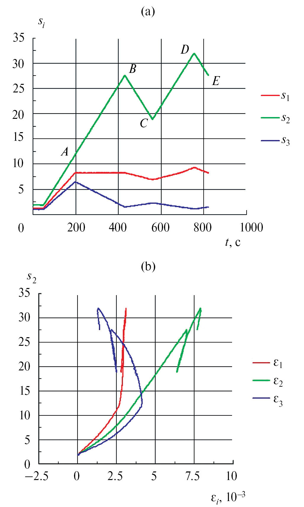 На рис. 2 и 3 приведены зависимости от времени t [c] напряжений [МПа], прикладываемых в ходе опыта к образцам по осям нагружения 1, 2, 3 установки ИСТНН, (а), и кривые деформирования (b) в ходе нагружения образцов по программам, отвечающих изменению напряжений на контуре горизонтальной скважины. При составлении программ нагружения принималось, что исходное природное напряженное состояние в пласте является неравномерным, так что где действует в вертикальном направлении и является максимальным, а q1 и q2 максимальное и минимальное горизонтальные исходные природные напряжения, причем . В приведенных выше соотношениях принималось .