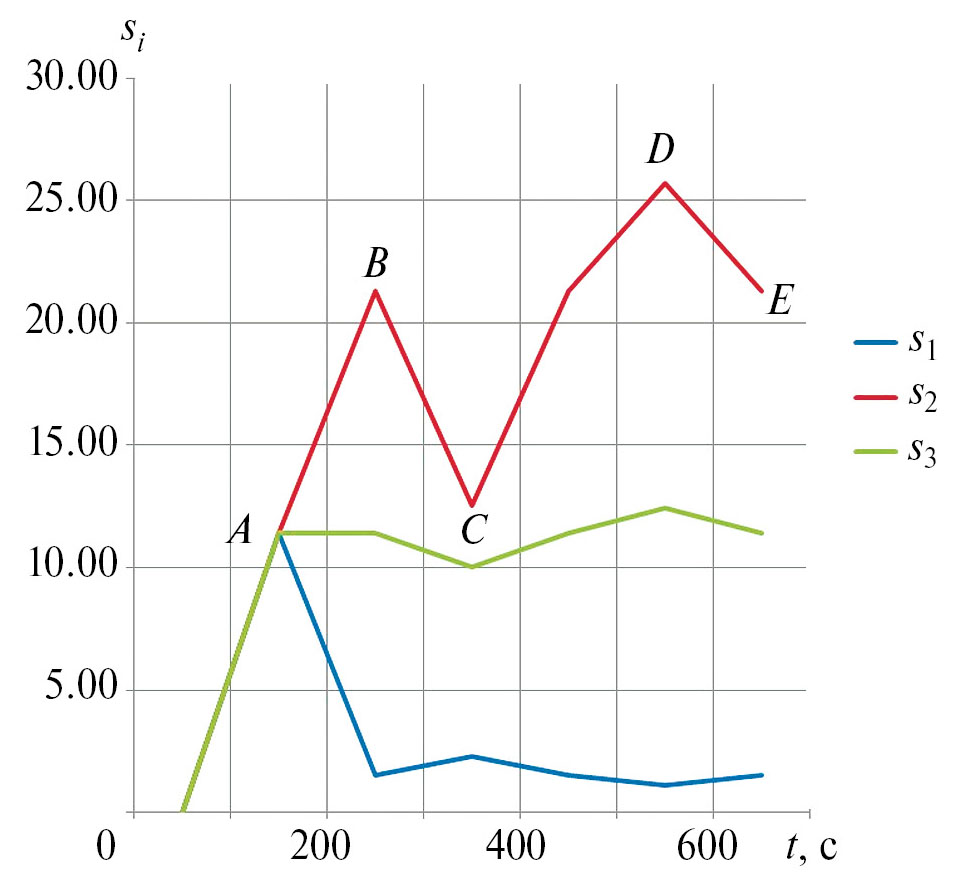 В программе нагружения точка А соответствует напряжениям в пласте до пробуривания скважины; точка В соответствует напряжениям на контуре скважины, когда скважина пробурена и заполнена технической водой; точка С конец закачки газа в пласт; точка D конец отбора газа; точка Е давление в пласте равно начальному.