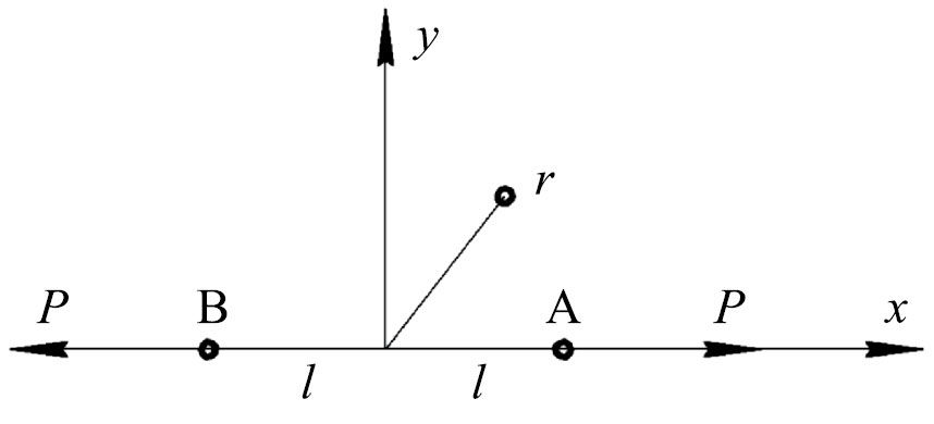 В двух точках неограниченной пластины действуют две коллинеарные и направленные в разные стороны одинаковые силы. Необходимо найти зависимость расстояния между точками от силы. Решение задачи классической теории упругости о действии на неограниченную пластину силы P, приложенной в начале координат в направлении оси x, получается с помощью представления Папковича–Нейбера и имеет вид: