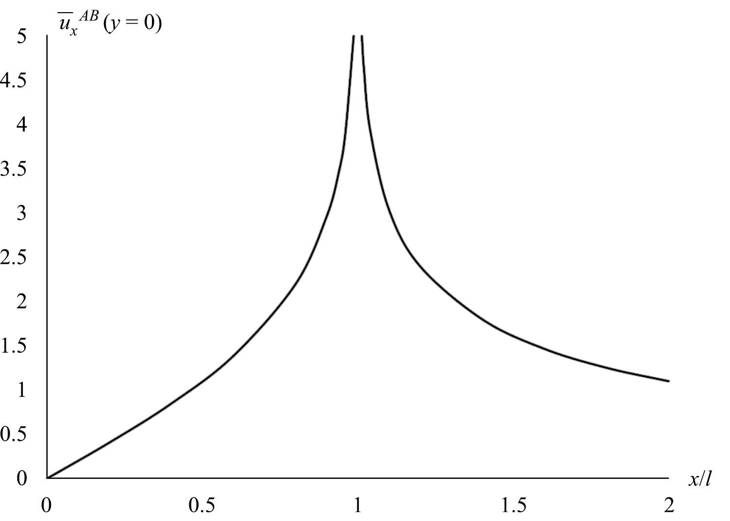 При x = 0 имеем UxAB = 0, что соответствует условию симметрии задачи (рис. 1), при x = ±l, то есть в точках A и B, решение (3.6) является сингулярным. Перемещения оказываются бесконечно большими, что не имеет физического смысла. Зависимость относительного перемещения