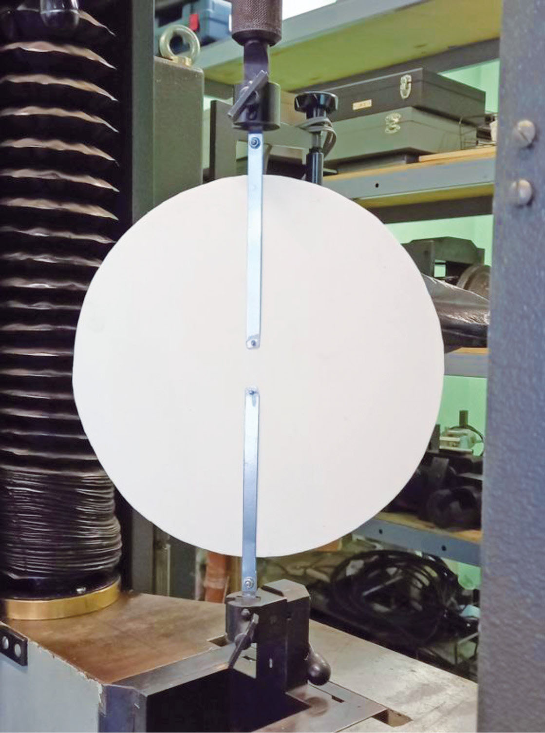 Для определения параметра s, входящего в полученное решение, был проведен эксперимент. Для этого был использован круглый диск из относительно жесткой силиконовой резины с упругими постоянными = 1.25 МПа, = 0.48. Диаметр диска 250 мм, толщина h = 4.7 мм. Диск был проколот в окрестности центра двумя заостренными стержнями с диаметром 2 мм, которые располагались на различном расстоянии друг от друга (от 20 до 100 мм). С обеих сторон диска на стержни были установлены тяги, к которым прикладывалась сила P (рис. 3). Экспериментально определялась зависимость увеличения расстояния между стержнями от силы. Диаметр стержней был выбран в результате предварительных экспериментов. Дело в том, что при малом диаметре стержней наблюдается их локальное внедрение в резину и зависимость между силой и расстоянием между стержнями оказывается нелинейной. Диаметр 2 мм является наименьшим значением, при котором эта зависимость оказывается линейной.