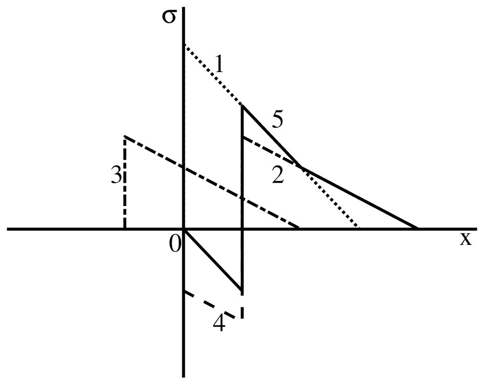 Рис. 1. Формирование импульсов напряжения. 1 – начальные напряжения, 2 – полуволна, идущая в глубь материала, 3 – полуволна, идущая к свободной поверхности, 4 – отраженная волна, 5 – суперпозиция волн