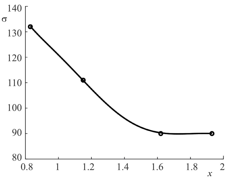 Как было сказано выше, в каждом выбранном сечении образца с помощью пьезодатчика измерялся профиль напряжения сжатия. На рис. 6 приведена кривая изменения амплитуды напряжения сжатия от координаты σ(x). Данный рисунок показывает также релаксационный характер изменения амплитуды импульса сжатия в неравновесной области от его первоначального значения 320 МПа до стационарного значения 90 МПа.