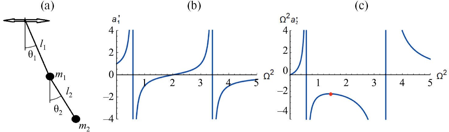Рис. 1. Схема двойного маятника (а), амплитудный коэффициент угловой переменной 1 (b), коэффициент, пропорциональный амплитуде угловой переменной 2 (c).