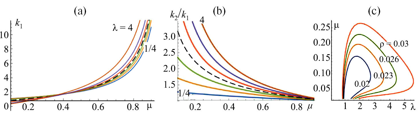 На рис. 2, а представлены зависимости амплитудных коэффициентов k1 от параметра масс при различных значениях отношений длин: = l2/l2 = 1/4, 1/2, 3/4, 1, 4/3, 2 и 4. Значения 1/4 и 4 для соответствующих кривых указаны на рисунке. На рис. 2, b представлены зависимости отношения амплитудных коэффициентов k2/k1 для угловых переменных 1, 2 соответственно от параметра масс m при тех же значениях отношений длин. Графики строятся с помощью формул (6.2). При кривые изображены штриховыми линиями.