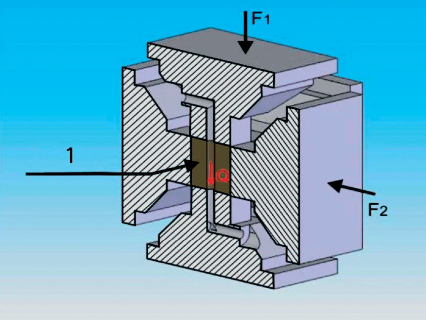 Установка ИСТНН позволяет проводить специальные эксперименты, аналогичные экспериментам по схеме “полый цилиндр” на установках с кармановской схемой нагружения, на кубических образцах с центральным отверстием. С этой целью в нагружающем узле установки ИСТНН используются специально изготовленные две нажимные плиты с центральными каналами, рис. 1.