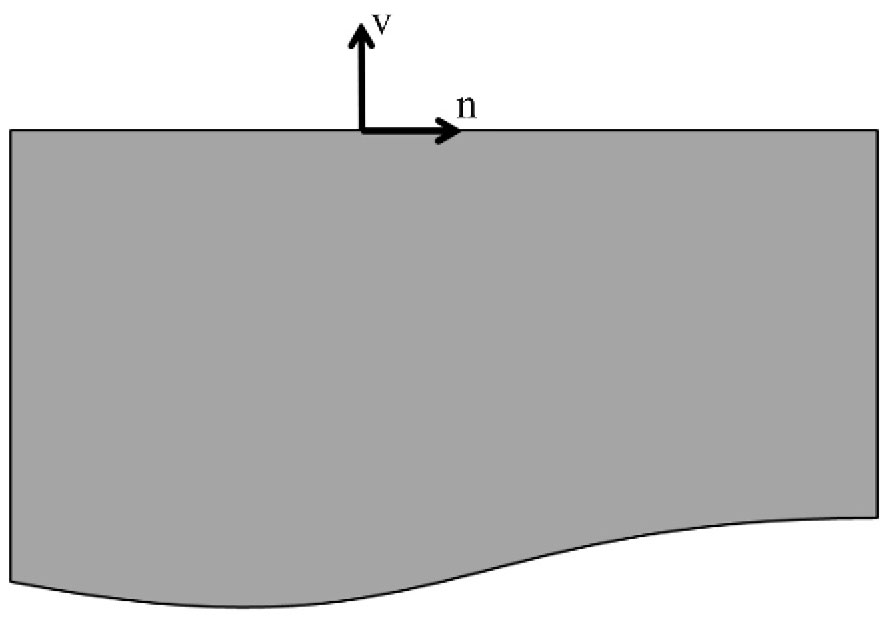 Рис. 1. Полупространство; n – волновой вектор; ν – единичная нормаль к свободной границе