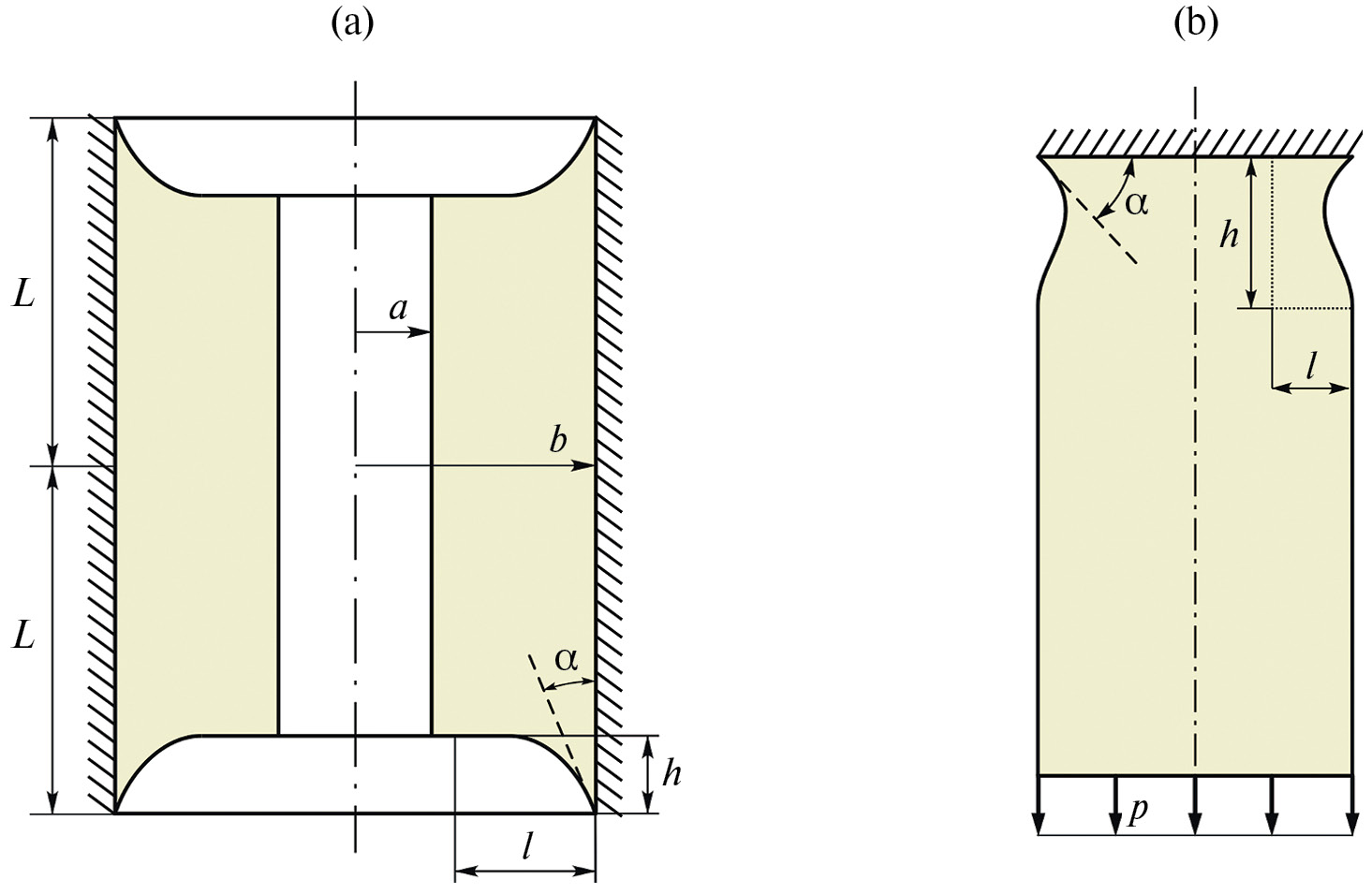 Аналогичная по постановке задача была рассмотрена в работах [8, 9], где для цилиндра, представленного на рис. 1, b, необходимо было найти геометрию боковой поверхности в окрестности точек, где имеет место смена типа граничных условий, при ограничениях h, l, за пределы которых не может выходить искомая геометрия. Были рассмотрены два варианта оптимизационной задачи. В первом — геометрия должна обеспечивать минимальную интенсивность касательных напряжений, во втором варианте — наименьшее отклонение отрывных напряжений на закрепленном торце от их среднего значения. Основным результатом решения оптимизационных задач является то, что все найденные геометрии для соответствующего значения коэффициента Пуассона материала имеют одинаковый угол сопряжения свободной от нагрузок и неподвижной поверхностей — a.
