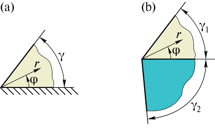 Рис. 2. Однородный (a) и составной (b) плоские клинья в полярных координатах.