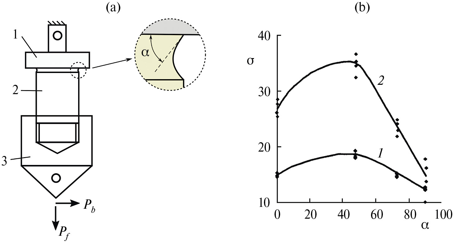 Рис. 4. Схема испытаний: 1 — стальной грибок, 2 — образец, 3 — нижний захват (a); зависимость прочности соединения s (в МПа) от угла стыка a (в градусах) при нормальном отрыве (1) и при консольном изгибе (2) (b).
