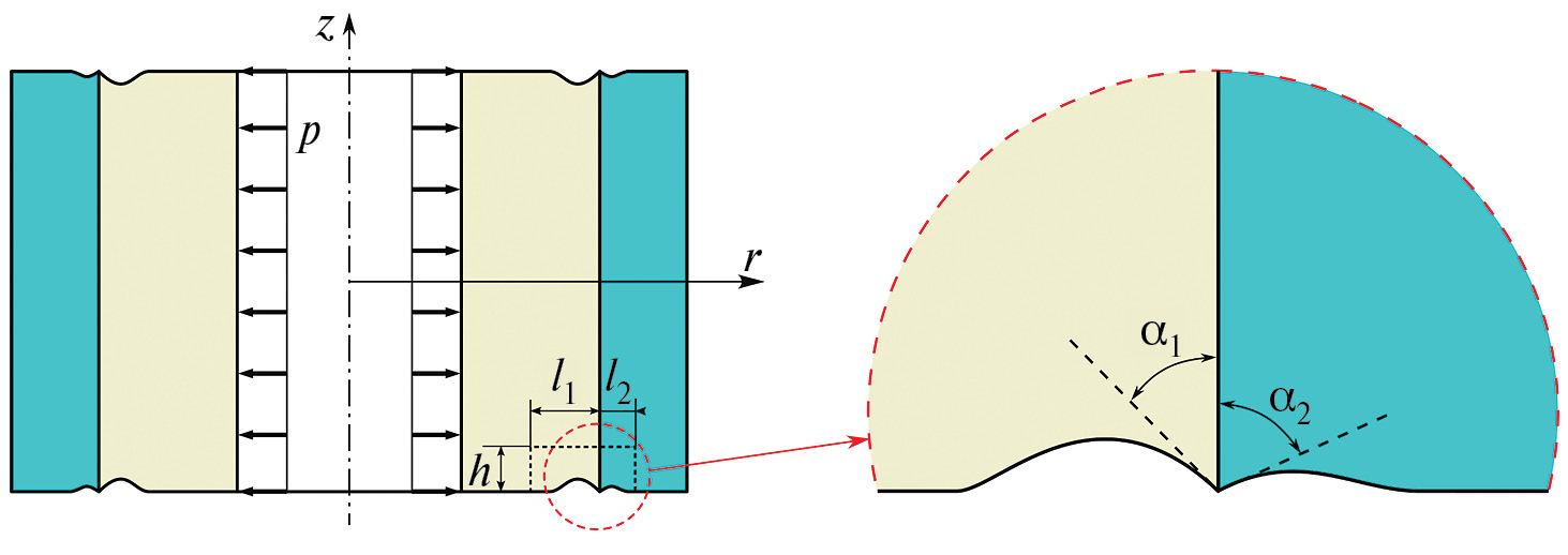 В работе [8] была рассмотрена задача для двухслойного цилиндра, находящегося под действием внутреннего давления (рис. 5). Решалась задача оптимизации, связанная с поиском геометрии торцевых поверхностей в окрестности особой точки — края поверхности соединения различных материалов — обеспечивающей минимальное значение интенсивности касательных напряжений в окрестности особой точки. Ограничения h, l1, l2 определяют допустимую область изменения геометрии. Результатом решения оптимизационных задач являются геометрии торцевых поверхностей для разных комбинаций механических характеристик материалов и ограничений h, l1, l2. Для каждой из комбинаций механических характеристик материалов найденные оптимальные геометрии имеют одинаковые углы сопряжения a1, a2 в особой точке свободных от нагрузок поверхностей и поверхности соединения материалов.
