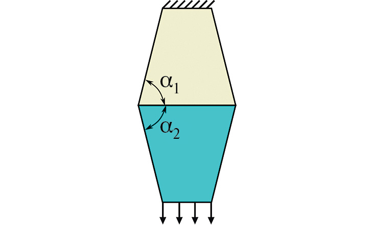 В работе [19] на примере соединения двух трапецеидальных пластин из различных материалов (рис. 6) в результате решения оптимизационной задачи также было показано, что минимальный уровень напряжений на поверхности соединения материалов соответствует границе между решениями с сингулярностью и без сингулярности напряжений.