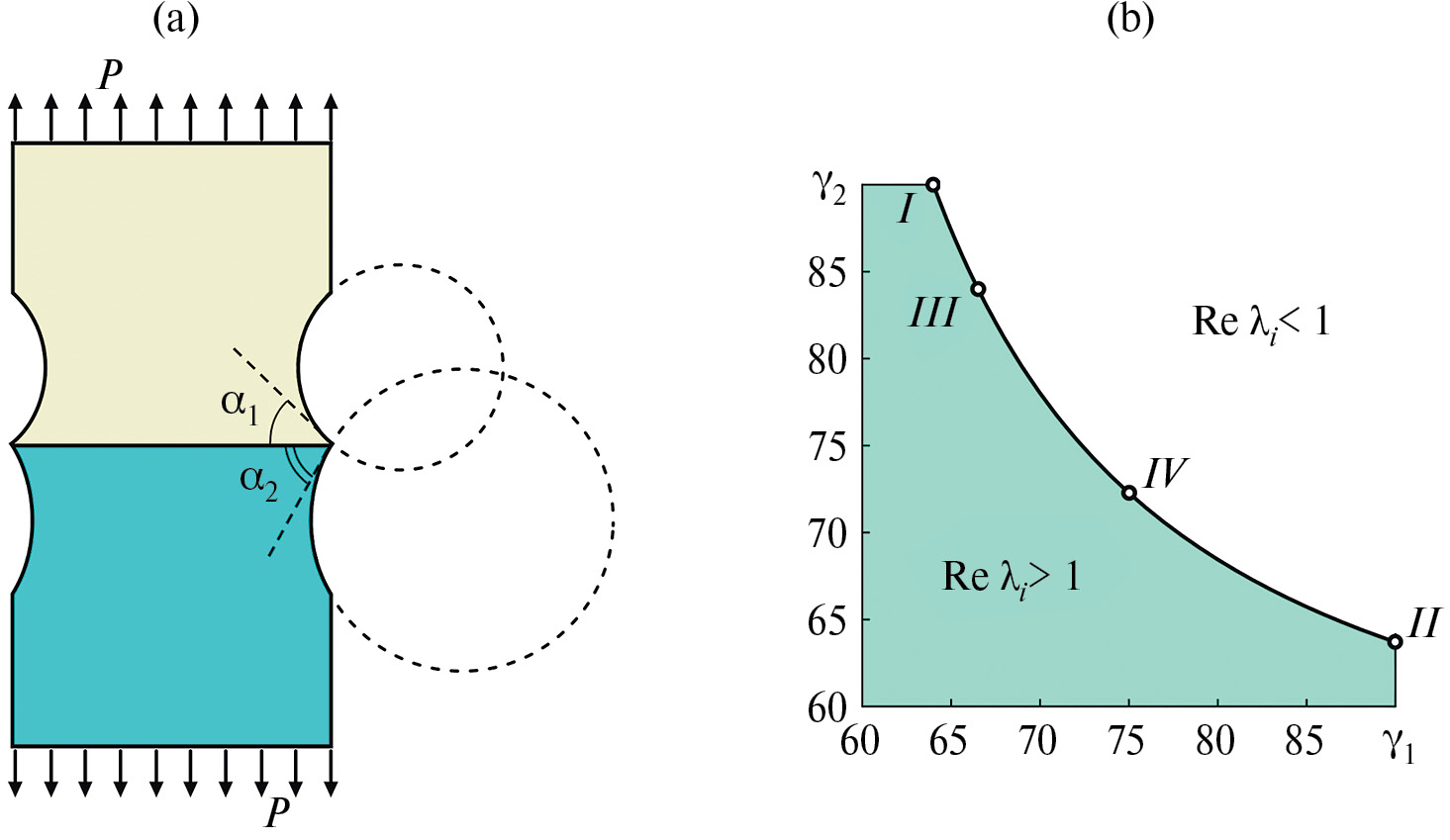 В работе [20] проанализирована неединственность значений углов, обеспечивающих оптимальный вариант. Был рассмотрен составной цилиндр, представленный на рис. 7, a. Рассматривалась задача поиска оптимальной формы боковой поверхности при использовании в качестве изменяемой части боковой поверхности дуг окружности. В качестве критериев оптимизации использовались значения интенсивности напряжений в одной из составных частей цилиндрического тела, либо условие, обеспечивающее наименьшее отклонение напряжений по поверхности соединения от их среднего значения на этой поверхности. В одном из рассмотренных вариантов были следующие значения упругих постоянных: . На рис. 7, b для этого варианта представлена кривая, разделяющая в области значений решения с сингулярностью и без сингулярности напряжений.