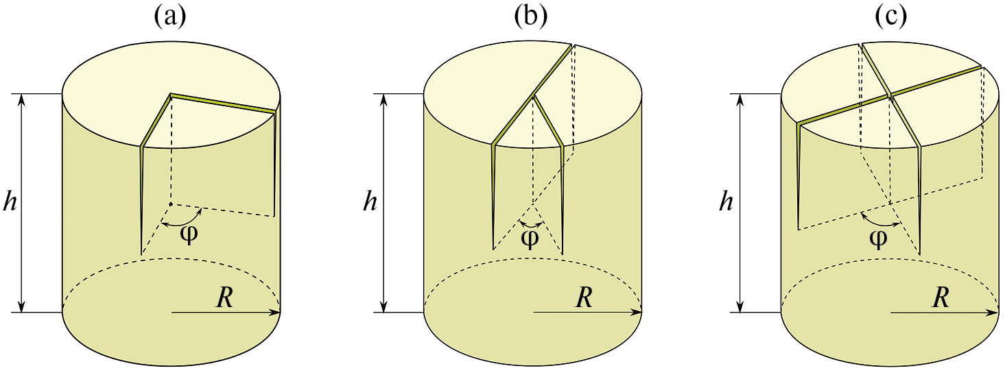 Аналогично для трех трещин рассмотрены две наиболее распространенные конфигурации: Y и T. Установлено, что для T-конфигурации максимуму средней плотности энергии деформаций и наименьшему значению показателя сингулярности напряжений отвечает угол = 90°, что полностью соответствует симметричной T-конфигурации, встречающейся в реальных картинах поверхностных трещин. Для X-конфигурации из четырех трещин выявлено, что максимум средней плотности энергии деформаций и наименьшее значение показателя сингулярности имеют место, когда все углы между четырьмя трещинам равны. Это также совпадает с закономерностью, наблюдаемой в реальных картинах трещин.