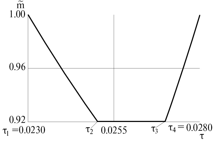 На рис. 1 изображены графики изменения границ области вязкопластического течения в зависимости от безразмерного времени t: в интервале от t1 = 0.023 до t3 = 0.027 и в интервале от t3 до t4 = 0.028. Из графика видно, что в интервале от t2 = 0.025 до t3, соответствующем постоянному перепаду давления, изменения границы области течения не происходит. С момента времени t3 от границы m(t3)/R в обратном направлении движется граница m1(t)/R, которая в момент времени t4 достигает границы r = R и течение в материале прекращается.