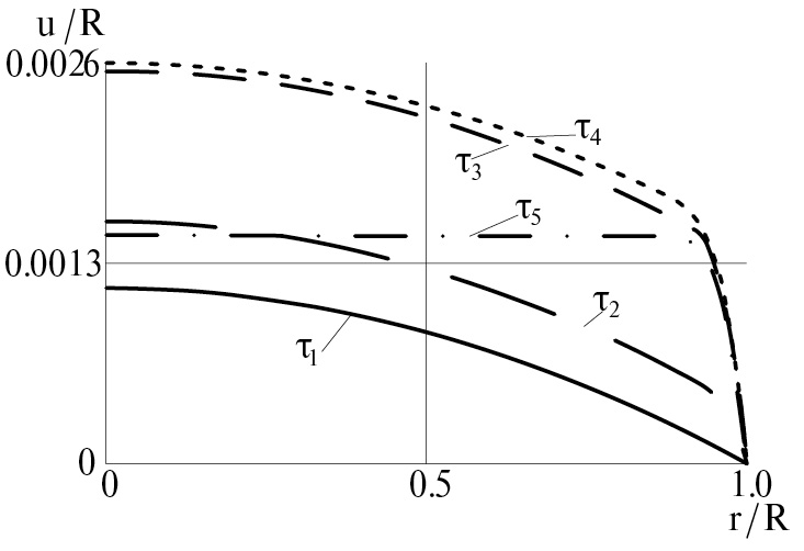 Рис. 3 иллюстрирует графики перемещений u/R в зависимости от радиуса r/R в моменты времени t1, t2, t3, t4 и t5 = 0.0395. Все моменты времени, кроме последнего, демонстрируют увеличение перемещений, тогда как в последний момент времени t5, соответствующий нулевому перепаду давления, перемещения снижаются за счет исчезновения обратимых деформаций.