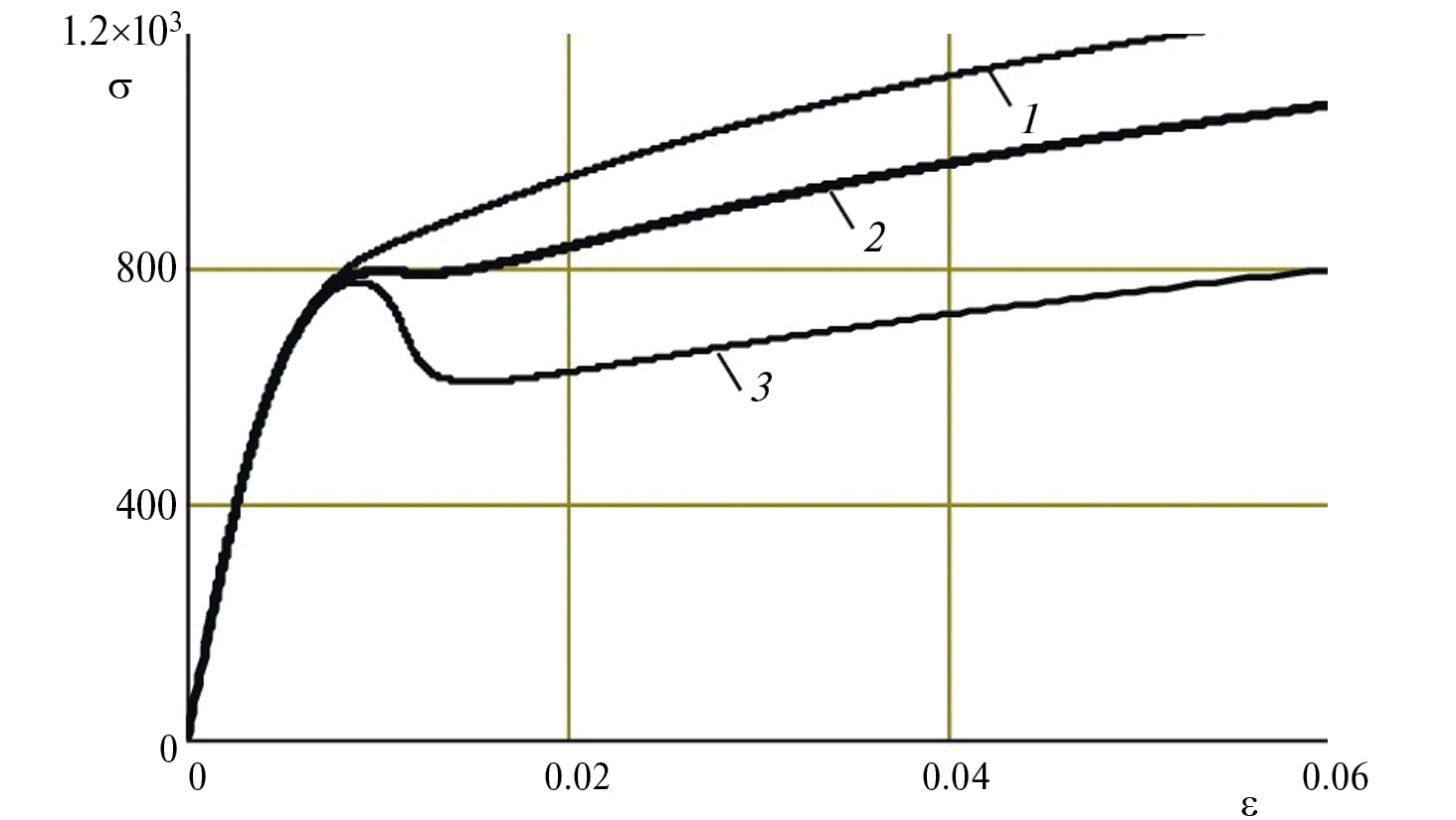 Анализ (3.15) с учетом (3.8), (3.14) показывает резкое уменьшение параметра b′, при переходе от обратимого деформирования к необратимому деформированию. Относительные флуктуации деформаций увеличиваются с ростом p, а относительные флуктуации напряжений уменьшаются. При падение b′ на начальном этапе течения настолько резкое, что макроскопическая деформация растет при постоянном или даже при снижении напряжения. На рис. 2 представлены диаграммы деформирования, рассчитанные на основе (2.13), (2.14) с учетом (3.15), для трех значений коэффициента упрочнения: = 4 · 10-3 (кривая – 1), = 10-3 (кривая – 2), = 10-4 (кривая – 3). Остальные параметры имеют следующие значения: t0 = 10-3, Q = 500, A = 3, k = 1, C44 = 11.6 · 104 МАа, zÑ = 10-3. Заметим, что при замене переменную z′ в (2.13), (2.14) на z′(b, zÑ) (3.15), имеем: p(z′, b′) → p(b′), e(z′, b′) → e(b′), j(z′) → j(b′).