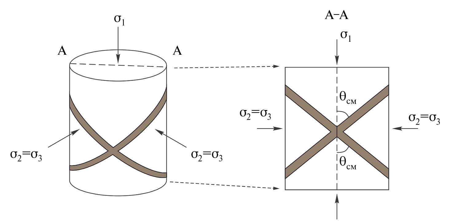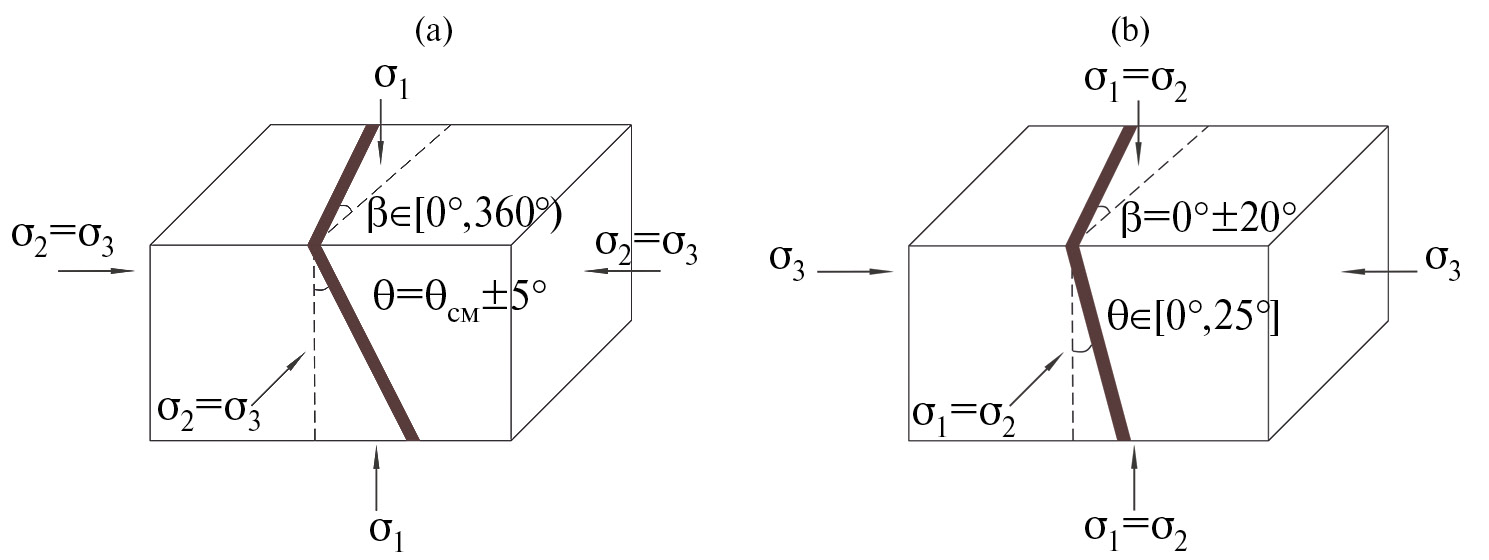 Начиная с пионерских работ Моги [20, 21], усилия научных коллективов по всему миру направлены на теоретико-экспериментальные исследования поведения горных пород различных литотипов в условиях истинного трехосного сжатия. При этом можно выделить несколько магистральных направлений исследований: экспериментальное исследование влияния величины промежуточного главного напряжения s2 на деформационное поведение горных пород [3, 6, 22, 23], разработка новых и обобщение известных критериев прочности пород на случай истинного трехосного сжатия [24–28], исследование влияния неравнокомпонентного трёхосного напряженного состояния на проницаемость, фильтрацию и ползучесть горных пород [29–31], определение условий проявления эффекта памяти (Кайзера) при циклическом непропорциональном трехосном сжатии горных пород [32–35]. Необходимо отметить, что вопросу ориентации плоскости разрушения (зоны локализованной поврежденности) в условиях истинного трехосного сжатия при различном соотношении главных напряжений уделяется недостаточно внимания [36]. Хотя именно информация о совокупности ориентации плоскостей сдвига/скола в полевых условиях может быть использована для оценки действующего регионального поля напряжений (наравне с моделями Кулона–Андерсона [37] и Риделя [38] для обстановок чистого и простого сдвига).